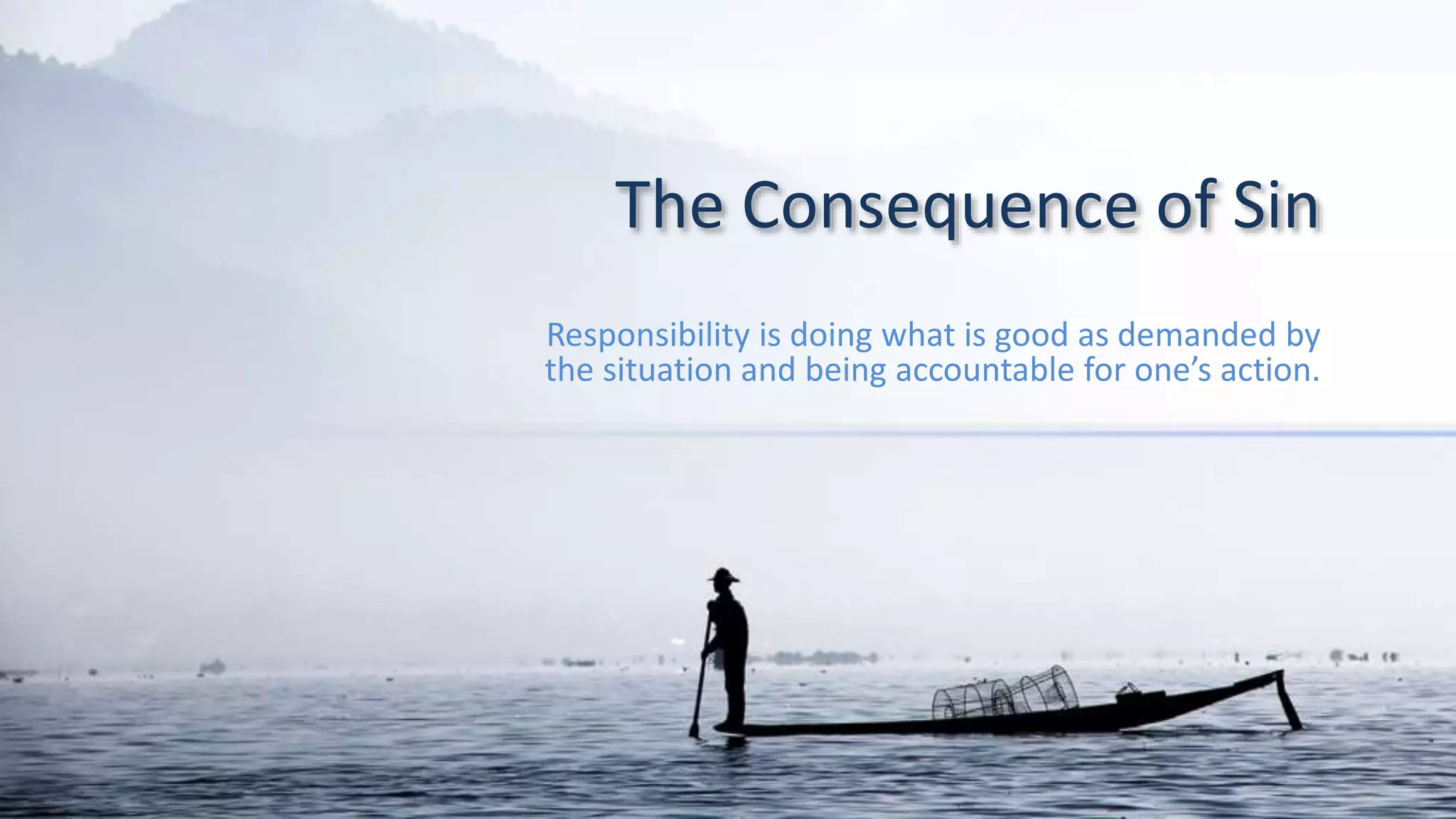 Sin has consequences according to religious texts. It causes death by turning people away from love and God. Sin destroys people from within because without love they cannot live. The wages of sin is death but God offers eternal life. The Old Testament viewed sin as missing God's intentions, being depraved in character, and rebelling against relationships. Committing sin kills the soul by making people lose sight of God. Sin can spiral out of control, make people feel unwell by stirring negative emotions, and become addictive by destroying personal relationships. Losing the sense of sin hardens the conscience.