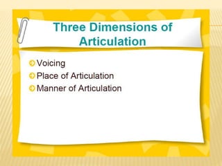 This document discusses different types of consonant sounds in English pronunciation: - Dental consonants involve the tongue touching or approaching the upper teeth, such as the sounds in "thin" and "then". - Alveopalatal consonants involve the tongue blocking air between the hard palate and alveolar ridge, including the sounds in "chip", "gym", "shore", and "azure". - Glottal consonants involve a narrow opening of the glottis, or space between vocal folds, creating turbulence in the airstream, such as the sound in "hi".