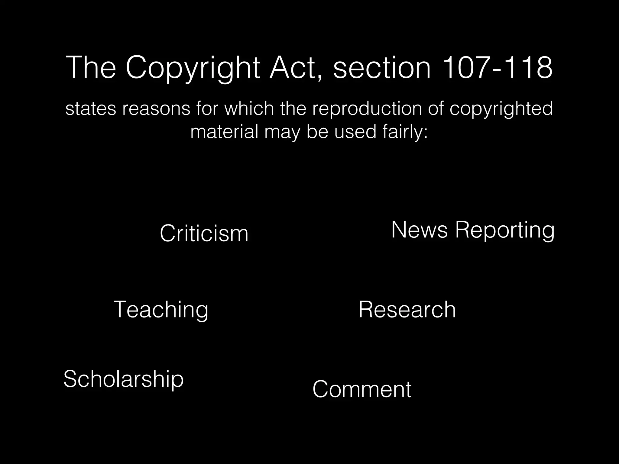 The document discusses US copyright law and the fair use doctrine. It outlines four factors courts consider for fair use cases: purpose/nature of use, nature of copyrighted work, amount of work used, and commercial effect. Transformation, or using a work in a new way that conveys new meaning or message, is key. Examples of fair use include criticism, commentary, news reporting, teaching, and scholarship. Best practices include using public domain works, obtaining permission, or exercising fair use. The document provides examples of whether certain uses would be considered fair use or not.