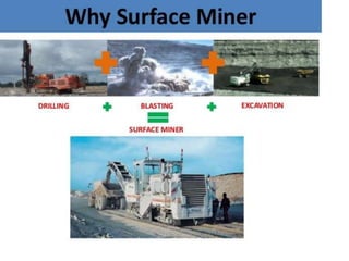The continuous surface miner is a modular machine that operates by using a rotating cutting drum fitted with cutting tools to cut material from rock formations in layers. As the crawler-mounted machine moves forward, the cutting drum rotates against the direction of travel to cut the material. The cutting tools transport the mined material toward the center of the drum where it can then be loaded onto conveyors. The mined materials can be directly loaded onto trucks, discharged to the side to be mixed, or deposited as a windrow between the miner's crawler tracks.