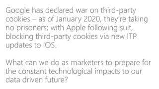 A brief guide to changes in legislation regarding GDPR and the tracking of online data via third-party cookies. A 'how to' on what you can do to optimize ongoing display advertising strategies, persuading your audiences with alternative methods.