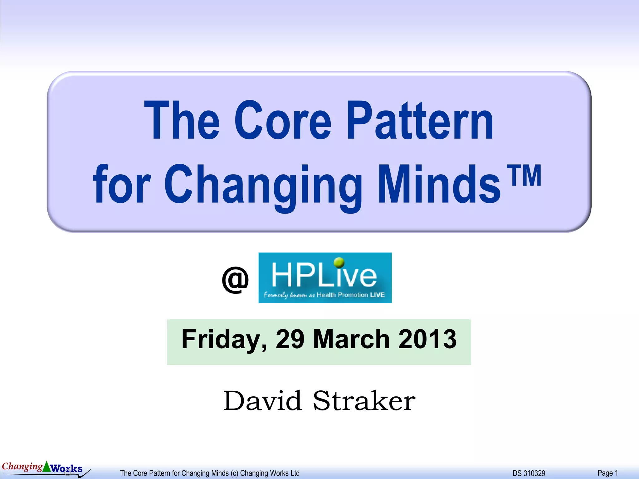 The document outlines a core pattern for changing minds called "The Core Pattern for Changing Minds" which involves addressing tensions through information, trust, and closure to build commitment. It discusses how this pattern was developed from various disciplines and techniques. The core pattern involves identifying gaps or tensions, managing tension levels, and closing gaps to build performance and flow.