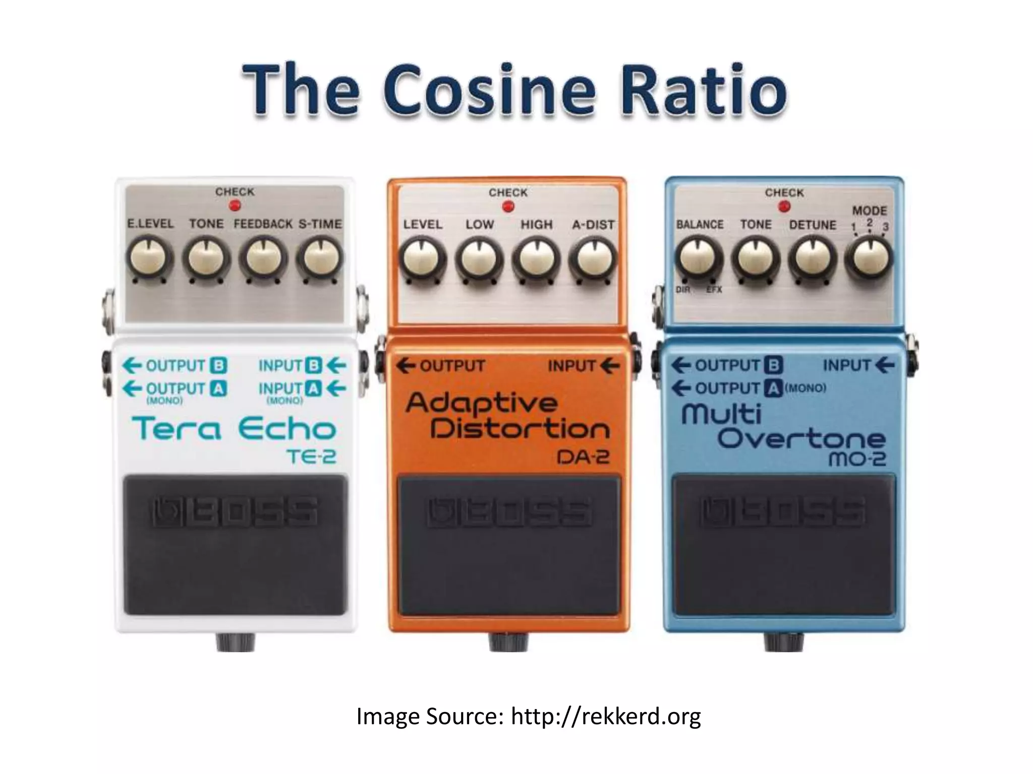 The document discusses the relationship between trigonometric functions like sine and cosine waves and sound waves. It explains that distorted heavy metal guitar sounds occur when smooth sine and cosine waves are transformed into square, sawtooth, or triangle waves. It then provides instructions and examples for using cosine functions to solve right triangle problems, including determining unknown side lengths or angles using special calculator buttons.