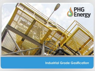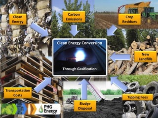 This document discusses industrial grade gasification technology provided by PHG Energy. It can gasify a variety of feedstocks to produce a clean burning syngas while also creating biochar. The process is not incineration and requires minimal emissions cleanup. It has been implemented in a waste-to-energy system in Covington, TN that saves the city on disposal costs while generating revenue from biochar sales and reducing landfill waste and CO2 emissions. PHG Energy systems can also be used for applications like wastewater treatment plant sludge drying. The technology enables a cost-effective way to convert local waste streams into renewable energy and useful byproducts.