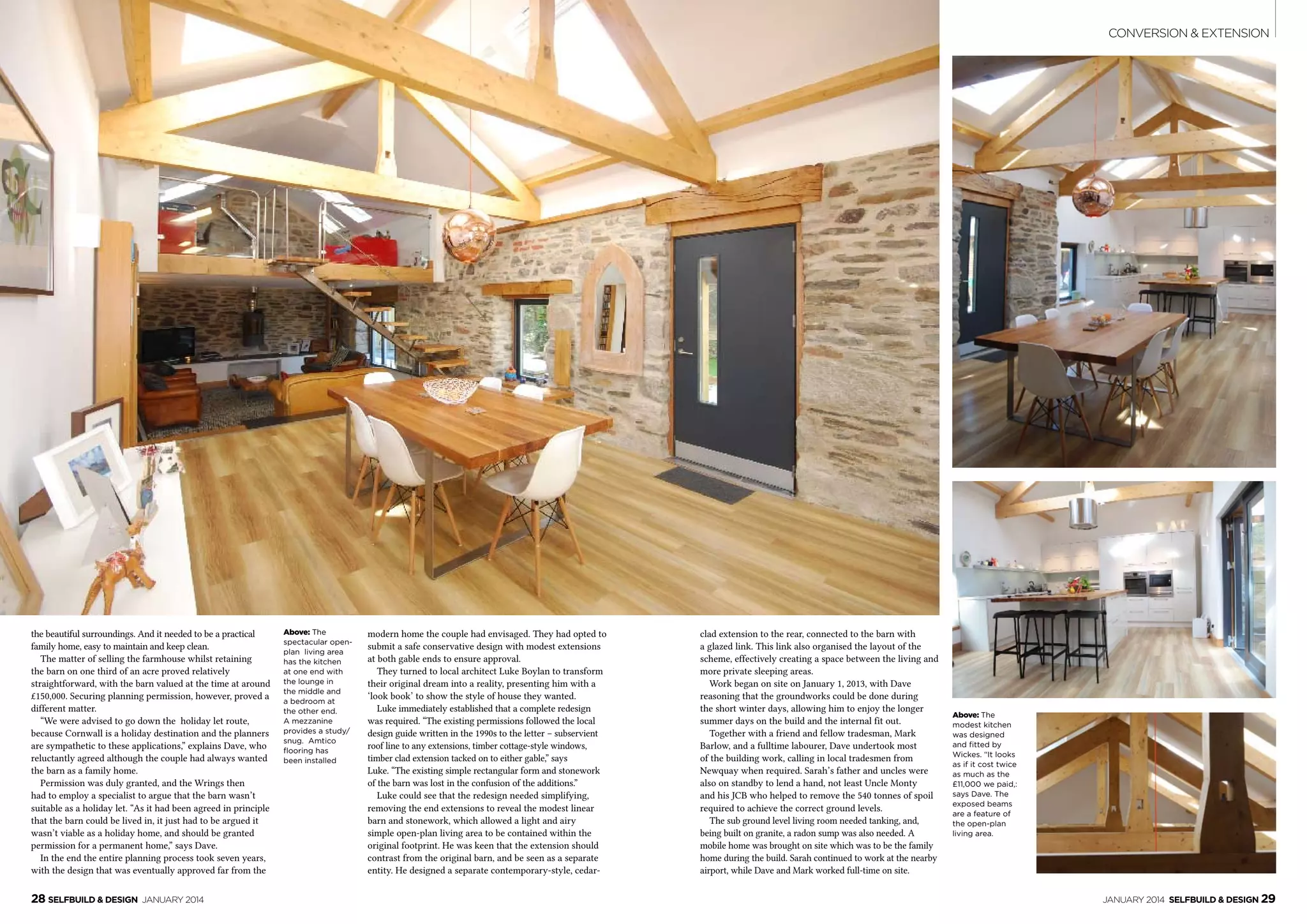 Dave and Sarah Wring converted a former 200-year-old cowshed in Cornwall into their family home after a seven-year battle to gain planning permission. Dave undertook much of the building work himself along with a friend. The conversion retained the original stone structure but added a contemporary western cedar-clad extension. Through high-quality materials, energy efficient systems, and Dave's expertise, the home achieved a rare B energy efficiency rating for a conversion. The Wrings have since put the property on the market and have their sights set on their next project.