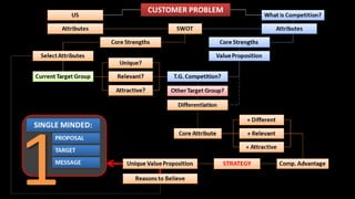 The document outlines various creative techniques and processes for integrated strategic planning and creative problem solving, emphasizing the importance of defining and analyzing problems accurately. It introduces methods such as assumptions-mashing, listing, branching, and analogy, aimed at generating innovative ideas through structured thinking. The text highlights the significance of differentiation and unique value propositions in marketing, alongside practical techniques for better understanding consumer needs and enhancing creativity.