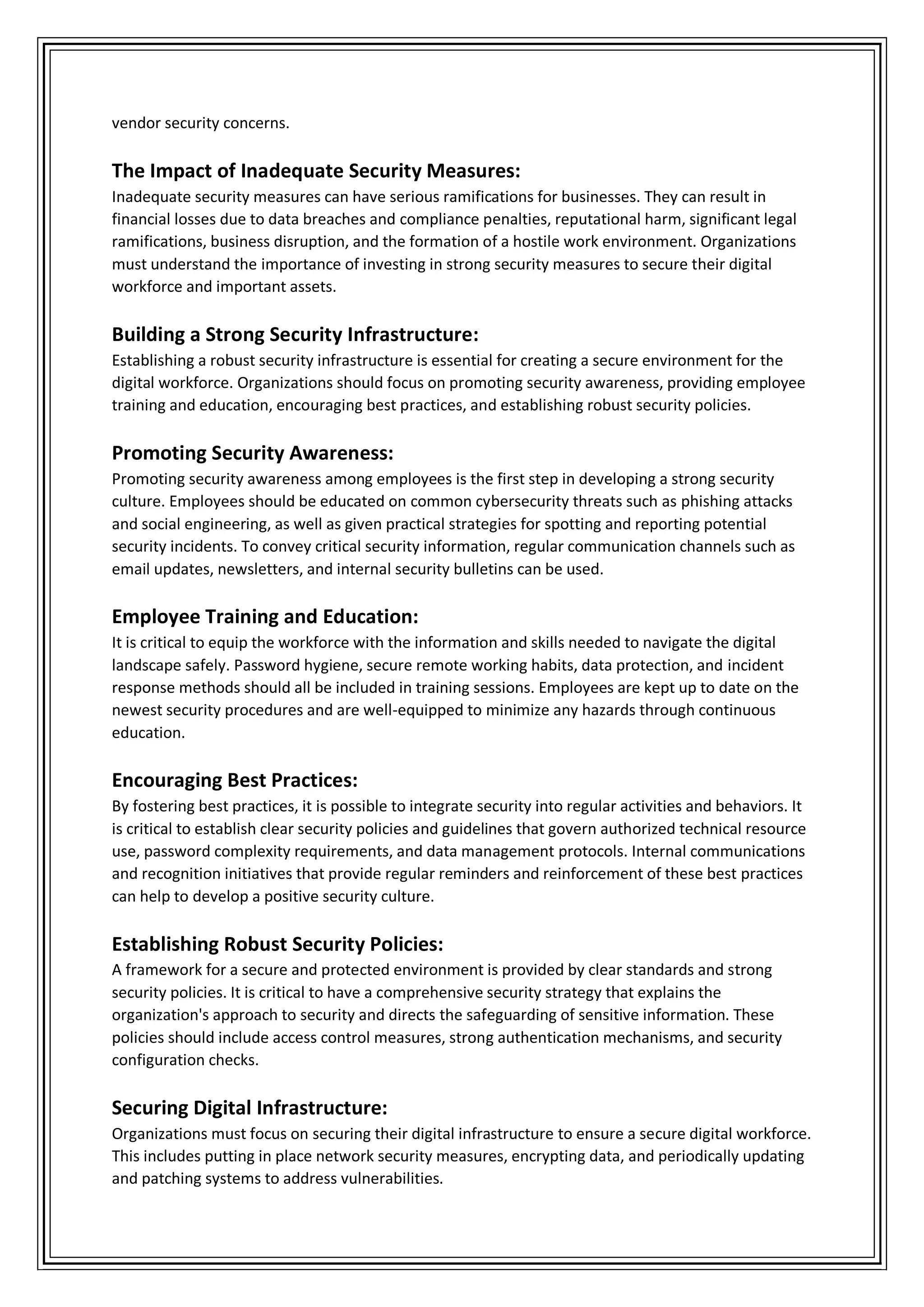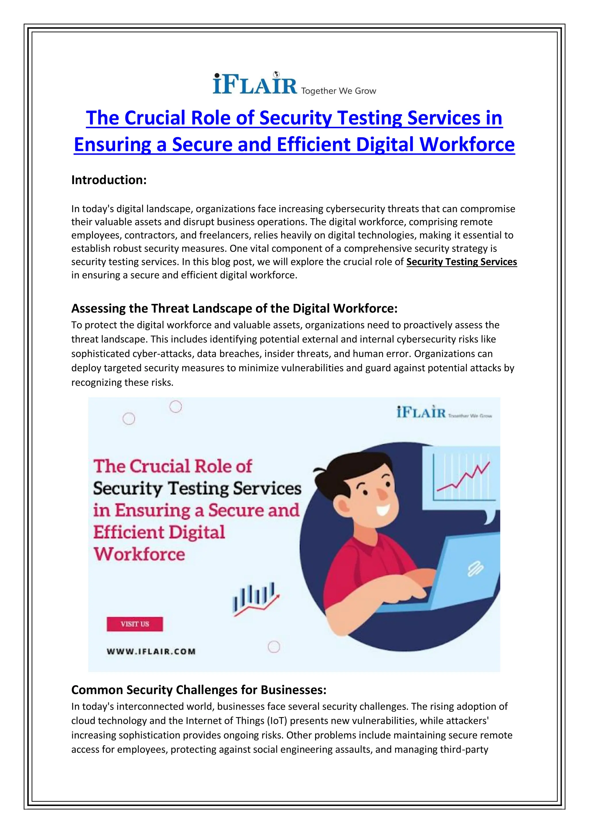 This document discusses the importance of security testing services in safeguarding a digital workforce against rising cybersecurity threats. It highlights the need for organizations to assess the threat landscape, implement robust security measures, promote employee awareness, and integrate security testing throughout the development lifecycle. Ultimately, it emphasizes investing in comprehensive security strategies to protect valuable assets and ensure a secure digital environment.