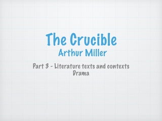 This document provides an overview of the elements and conventions of drama, with a focus on Arthur Miller's play The Crucible. It discusses the key components of drama, including setting, plot structure, characters, themes, and the limitations of staging plays. It also outlines different types of dramas and examines how The Crucible conforms to and deviates from these genres and conventions. The document concludes by providing guidance on writing formal analytical essays about literary texts, with a specific example for analyzing and interpreting The Crucible.