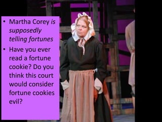 The document summarizes key events from Act 3 of The Crucible. Giles Corey tries to convince the court that the girls accusing people of witchcraft are frauds, but the judges refuse to consider this. Mary Warren admits in court that the girls are pretending, but is pressured into accusing Proctor of witchcraft. Proctor admits to an affair with Abigail in an attempt to discredit her, but Abigail shifts the blame to Mary Warren through hysteria. Hale resigns from the court, realizing the disastrous consequences of their proceedings.