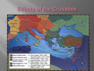 The Crusades were a series of Christian military expeditions between the 11th and 13th centuries to regain control of holy sites in Palestine from Muslim rule. They began as a response to Muslim control over Jerusalem but later expanded to conquering Muslim-held territories in Spain and Eastern Europe. Preaching of the First Crusade also triggered violent attacks against Jewish communities in Europe who were wrongly blamed for Jesus' death.