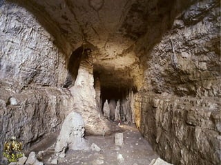 The document describes various cave formations found around the world. It discusses limestone caves in southern France that were formed by water dissolving limestone rock. It also describes an ice cave in Austria containing formations like icy needles and stalagmites formed from dripping water freezing. Finally, it mentions the deepest cave in the world located in Georgia that descends over 2,000 meters underground.