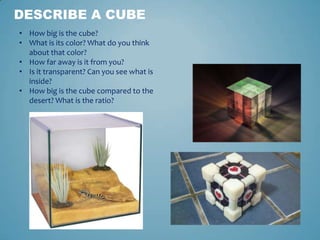The document provides a series of prompts to describe different objects that are not present: a cube, ladder, horse, storm, and flowers. The prompts ask the reader to imagine each object's characteristics such as size, color, location, and relationship to other objects. By describing imaginary objects and scenes, the prompts appear aimed at understanding the test taker's personality or thought processes.