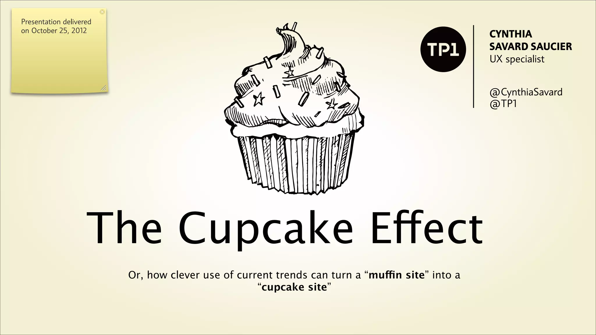 The presentation discusses the importance of strategically using design trends to elevate websites from mediocre to memorable experiences, as illustrated by the cupcake versus muffin analogy. It emphasizes that content is the foundation of any site, and that emotionally intelligent design, especially catering to women consumers, can enhance usability and engagement. Ultimately, the effective application of trends can create a 'cupcake site' that captivates and retains users.