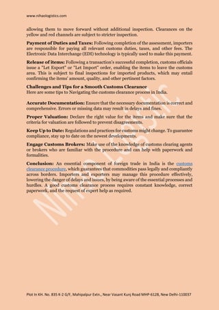 The document provides a comprehensive guide to the customs clearance process in India, detailing key steps such as documentation, customs duty assessment, declaration, and item release. It emphasizes the importance of accurate paperwork and staying updated with regulations to avoid delays and fines. Additionally, it suggests engaging customs brokers for assistance in navigating the process effectively.