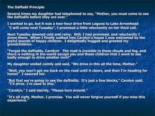 The author visits her daughter and is taken to see a large daffodil garden planted by a single woman over many years. She is inspired by the woman's persistence in planting one bulb at a time, creating something beautiful through small daily efforts over decades. The author realizes she too can accomplish great things by working incrementally each day towards her goals, rather than waiting for some future time. She is motivated to make the most of the present and start pursuing her dreams.