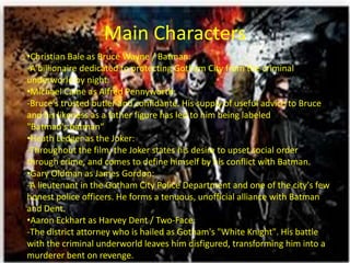 The document provides details about the main characters, plot, and themes of the film The Dark Knight. It describes the main characters including Christian Bale as Bruce Wayne/Batman, Michael Caine as Alfred, Heath Ledger as the Joker, Gary Oldman as James Gordon, and Aaron Eckhart as Harvey Dent/Two-Face. It summarizes the plot as Batman, Gordon, and Dent working to dismantle the criminal organizations in Gotham City but facing a new threat in the Joker. It then analyzes various elements of mise-en-scene, iconography, ideology, and genre features in the film.