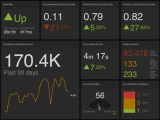 The document discusses lean startup methodology and achieving product-market fit. It emphasizes that product-market fit is a process, not a single event. It also stresses the importance of using data and metrics to guide decisions and measure progress towards product-market fit over time. Key metrics mentioned include customer acquisition cost, monthly recurring revenue, churn, and the financial impact of metrics.