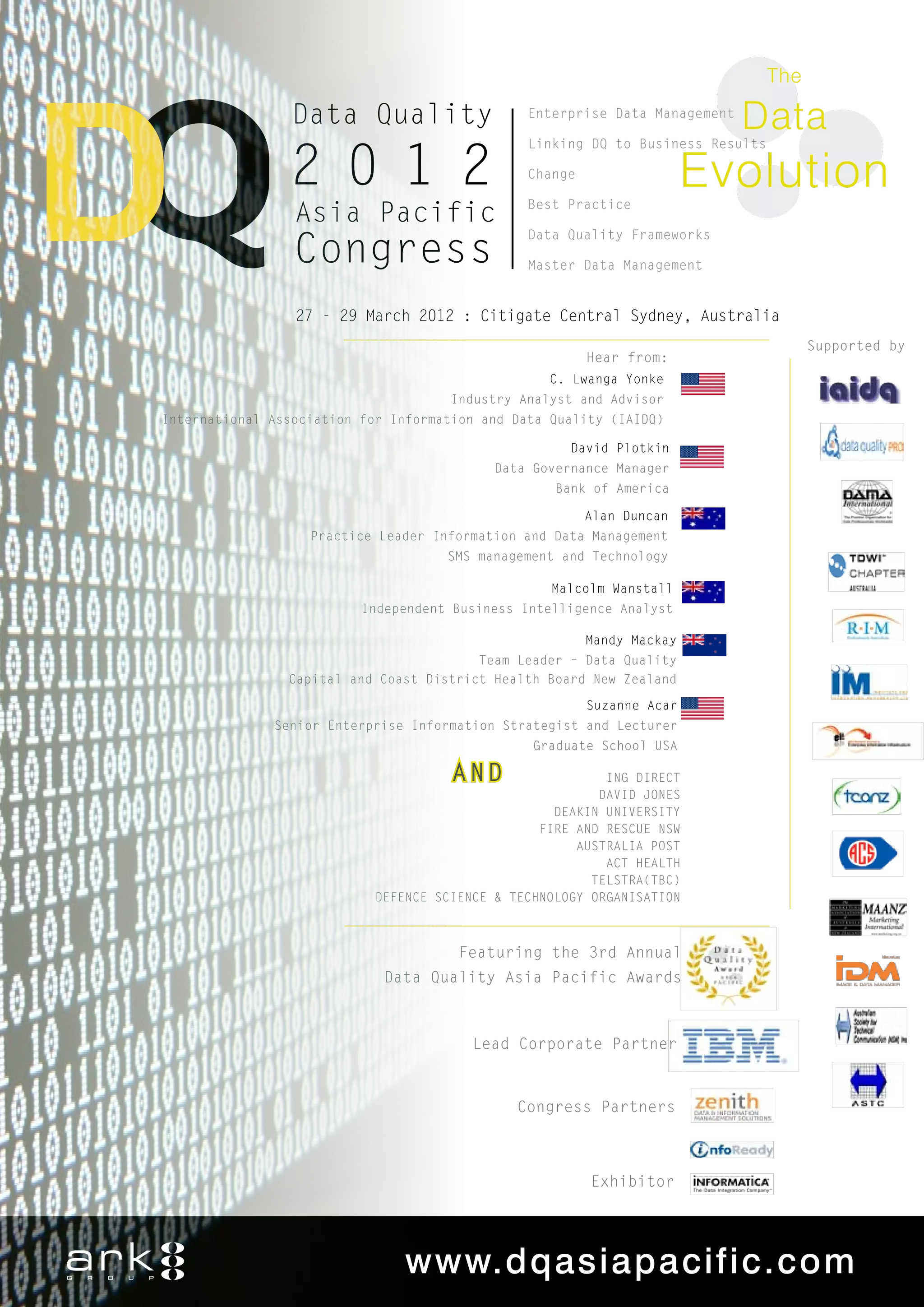This document provides an agenda for the Data Quality Asia Pacific Congress 2012, which will focus on challenges in data quality such as evolving business needs, increasing data volume, and new technology. The congress will feature expert speakers on topics like managing complex data, master data management, data governance, and communicating about data quality. It will also include the 3rd annual Data Quality Asia Pacific Awards that recognize outstanding achievement in data quality projects, and a general meeting of the International Association for Information and Data Quality.