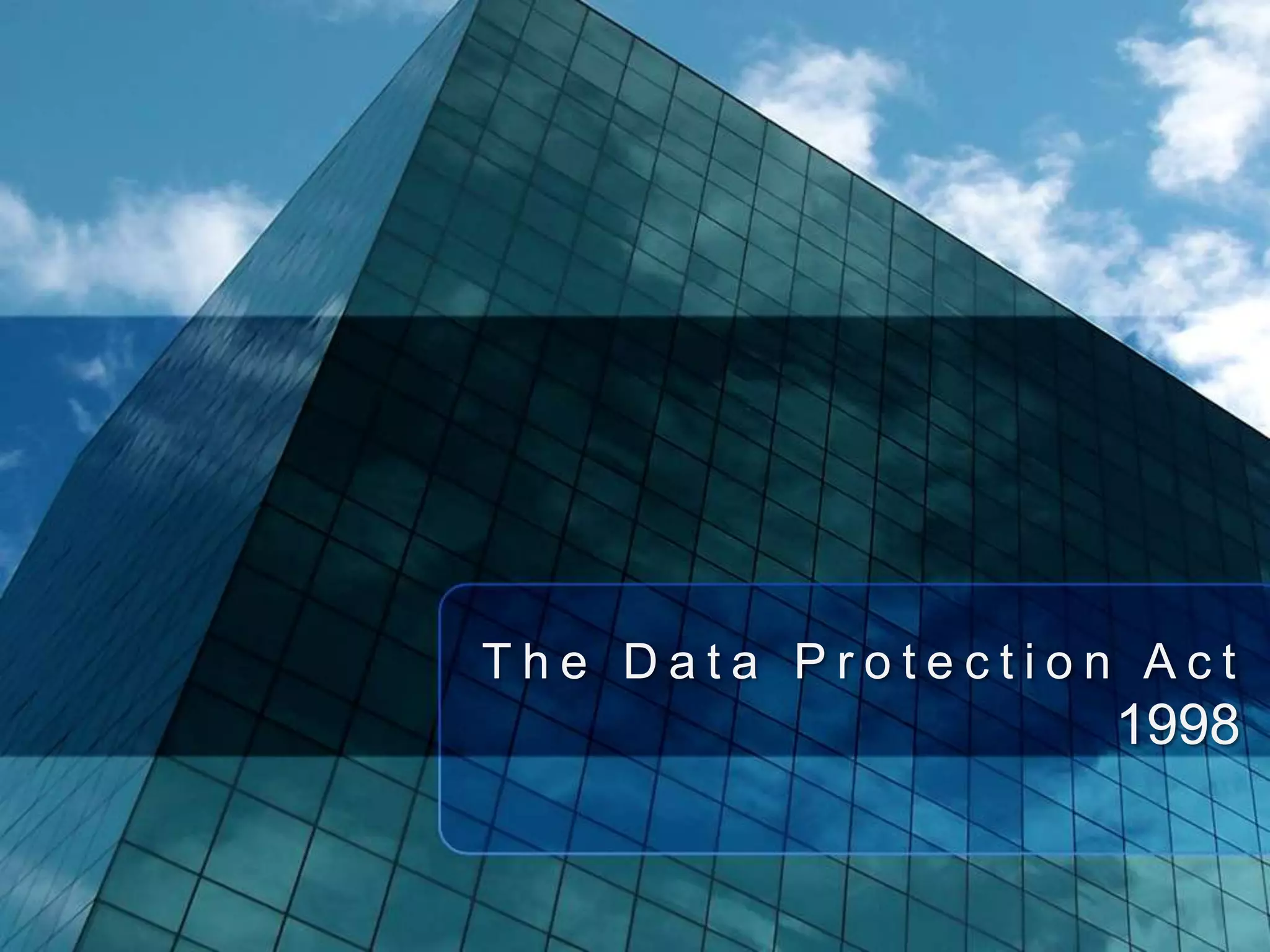 The Data Protection Act of 1998 established rules for how companies and organizations collect and use personal data to protect individuals' privacy. It requires that personal data be obtained fairly and lawfully, used for the specified purpose collected, kept securely, and not shared without permission. The Act was introduced because of concerns about how personal data stored in databases could be misused if accessed by unauthorized parties.