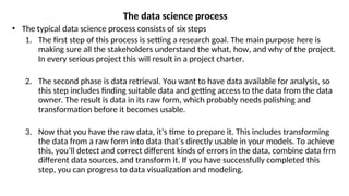 • The typical data science process consists of six steps