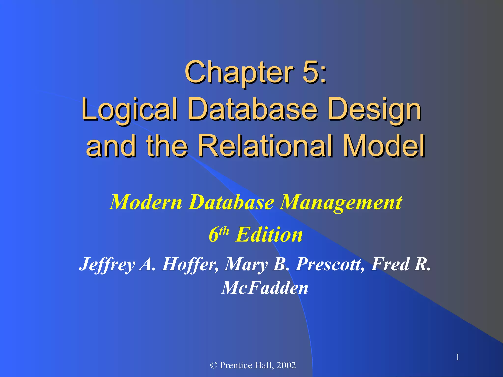 This document discusses logical database design and the relational model. It defines key concepts like relations, rows, columns, primary keys, and foreign keys. It explains how entity-relationship diagrams are transformed into relational schemas through mapping of entities, attributes, relationships and other constructs. The document also covers topics like integrity constraints, normalization, and the goals of normalization in eliminating anomalies and producing well-structured relations.