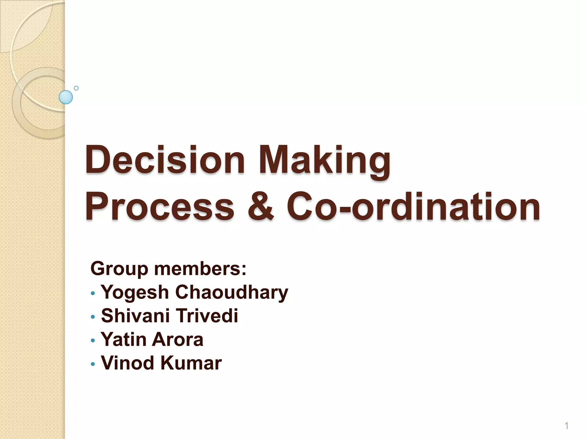 This document discusses decision making processes and coordination. It outlines the typical steps in an effective decision making process which include identifying the problem, generating alternative solutions, evaluating alternatives according to criteria, implementing the chosen alternative, and monitoring. It also discusses descriptive and normative models of decision making. The document then covers coordination as integrating separate organizational units to accomplish goals efficiently. It defines internal/external and vertical/horizontal coordination and techniques to achieve coordination like planning, communication, and leadership.