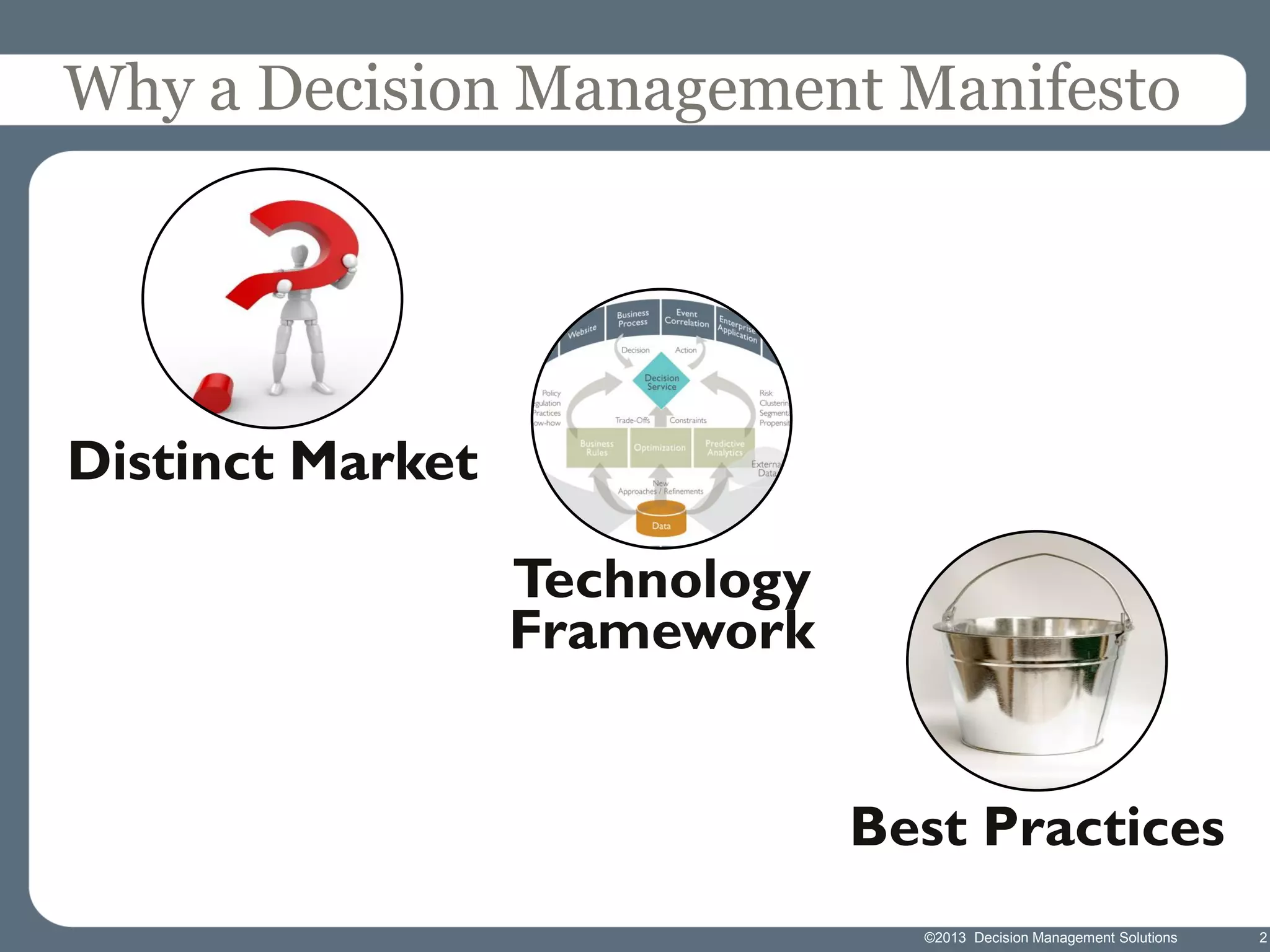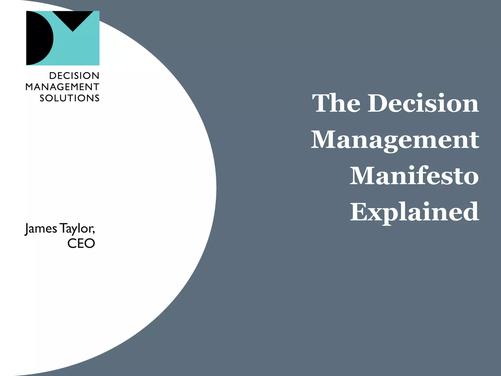 James Taylor presents the Decision Management Manifesto, outlining the need for a structured approach to decision-making that incorporates business rules, analytics, and technology. The manifesto advocates for explicit decision design and the use of decision management technologies to enhance business operations and improve decision quality. Key components include identifying critical decisions, deploying decision management systems, and ensuring transparency and continuous improvement in decision-making processes.
