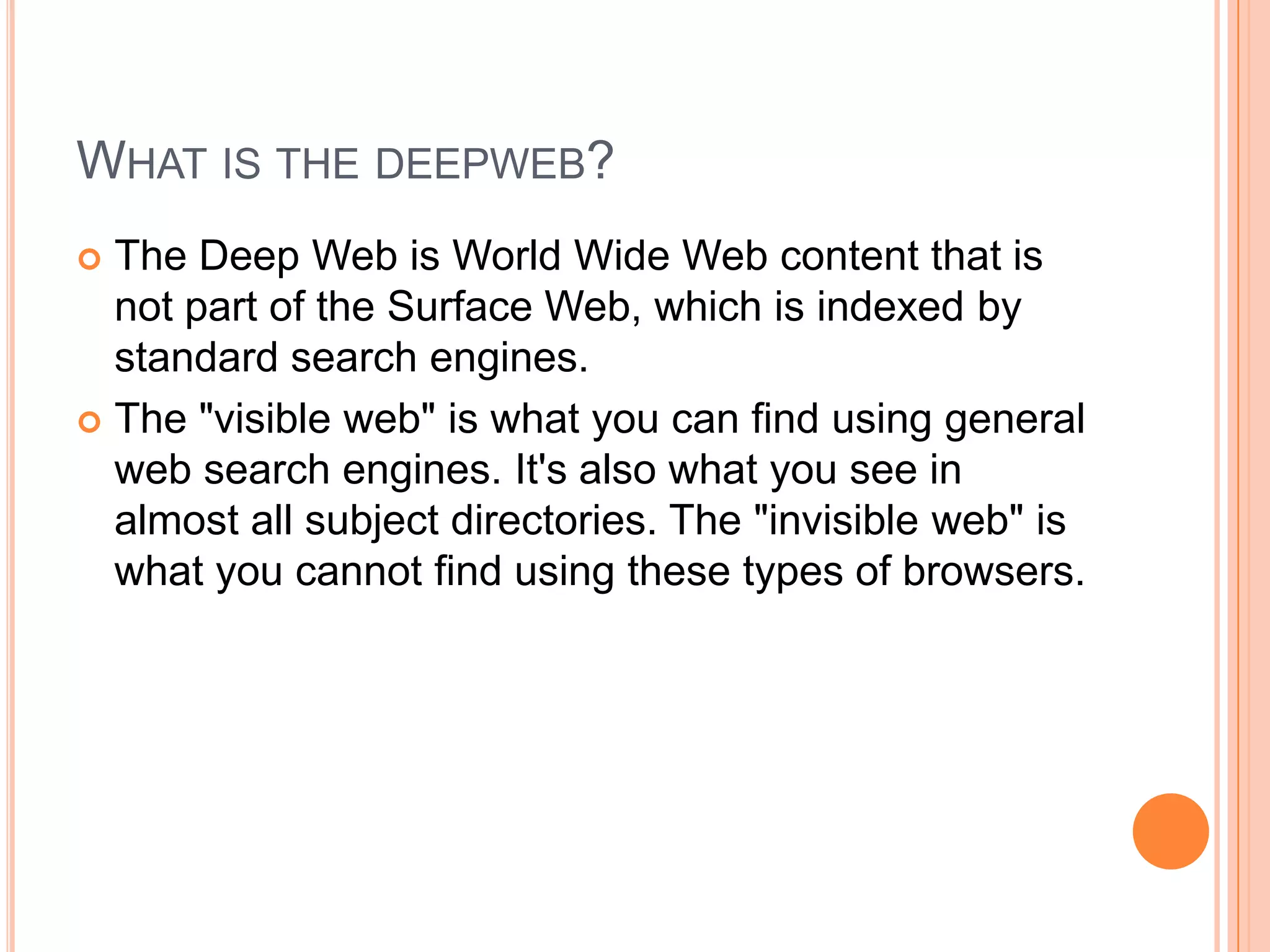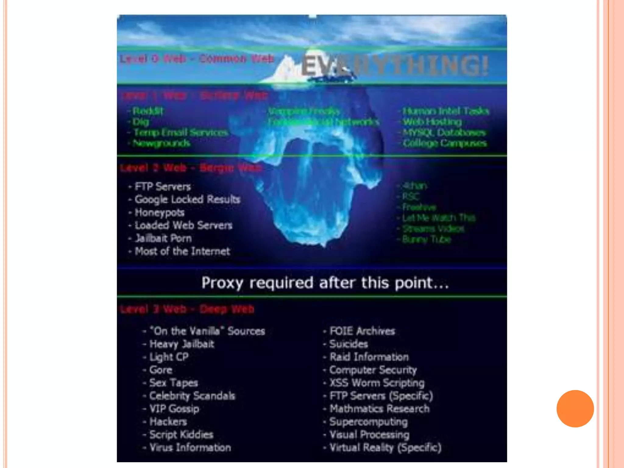 The deep web, also known as the invisible web, contains content that is not indexed by traditional search engines. It consists of an estimated 7,500 terabytes of information, including over 300,000 websites. To access the deep web, one must install the Tor browser to reach .onion addresses and access content like instructions on making devices, discussion forums, marketplaces, and information on Bitcoin, which allows anonymous possession and transfer of value.