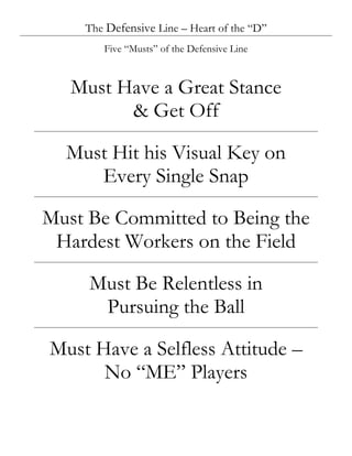 The document provides guidance on techniques for defensive linemen, including stances, keys, and blocking responsibilities. It outlines five "musts" for defensive linemen: having a great stance and get-off, hitting their visual key on every snap, being relentless workers, having a selfless attitude, and being committed to pursuing the ball. Various stances and techniques are defined, including one-gap, jet, and tilt alignments. Responsibilities against different block types like base, double team, and pull blocks are also covered.
