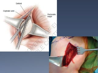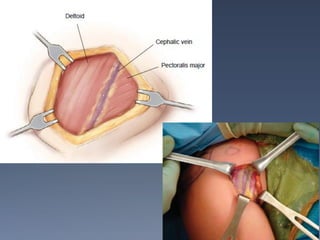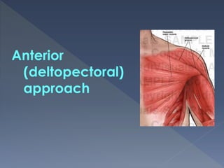 The anterior deltopectoral approach is used for various shoulder surgeries and fractures. It provides exposure of the shoulder joint and proximal humerus. The key steps are to identify the deltopectoral groove, preserve the cephalic vein, and laterally reflect the anterior deltoid. This exposes the coracoid process, joint capsule, tuberosities, and humeral head for procedures like shoulder arthroplasty and plating of humeral fractures. Care must be taken to protect structures like the axillary nerve and musculocutaneous nerve.