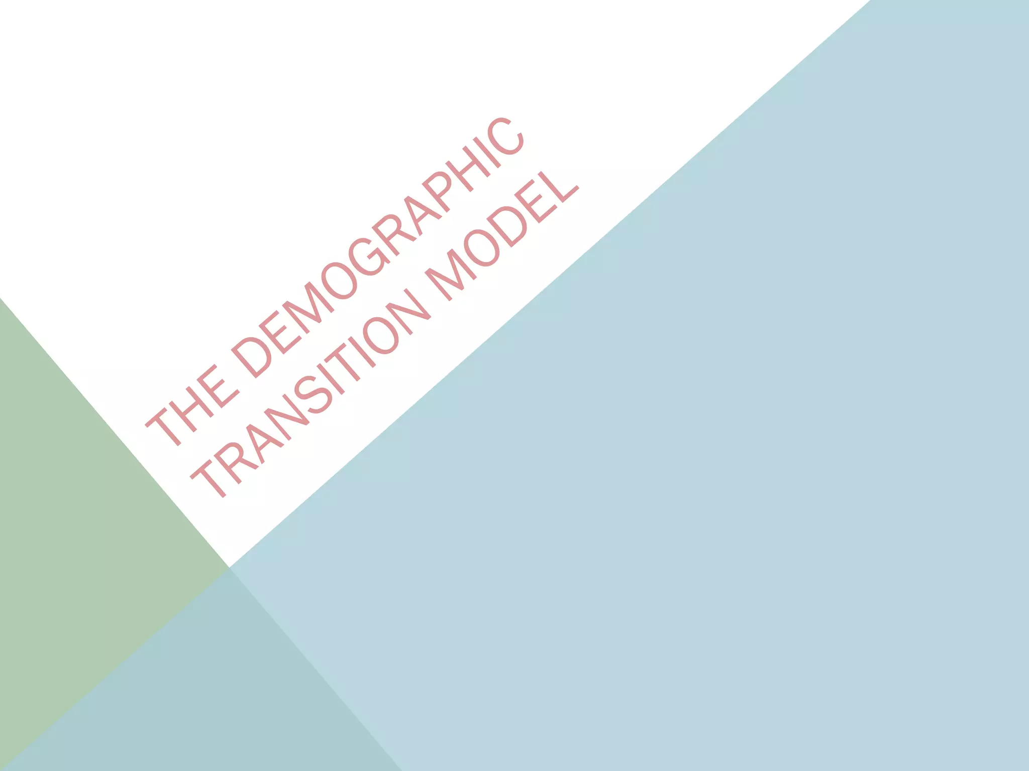 The document discusses the demographic transition model (DTM), which predicts population growth over time based on changes in birth rates and death rates. The DTM has five stages: