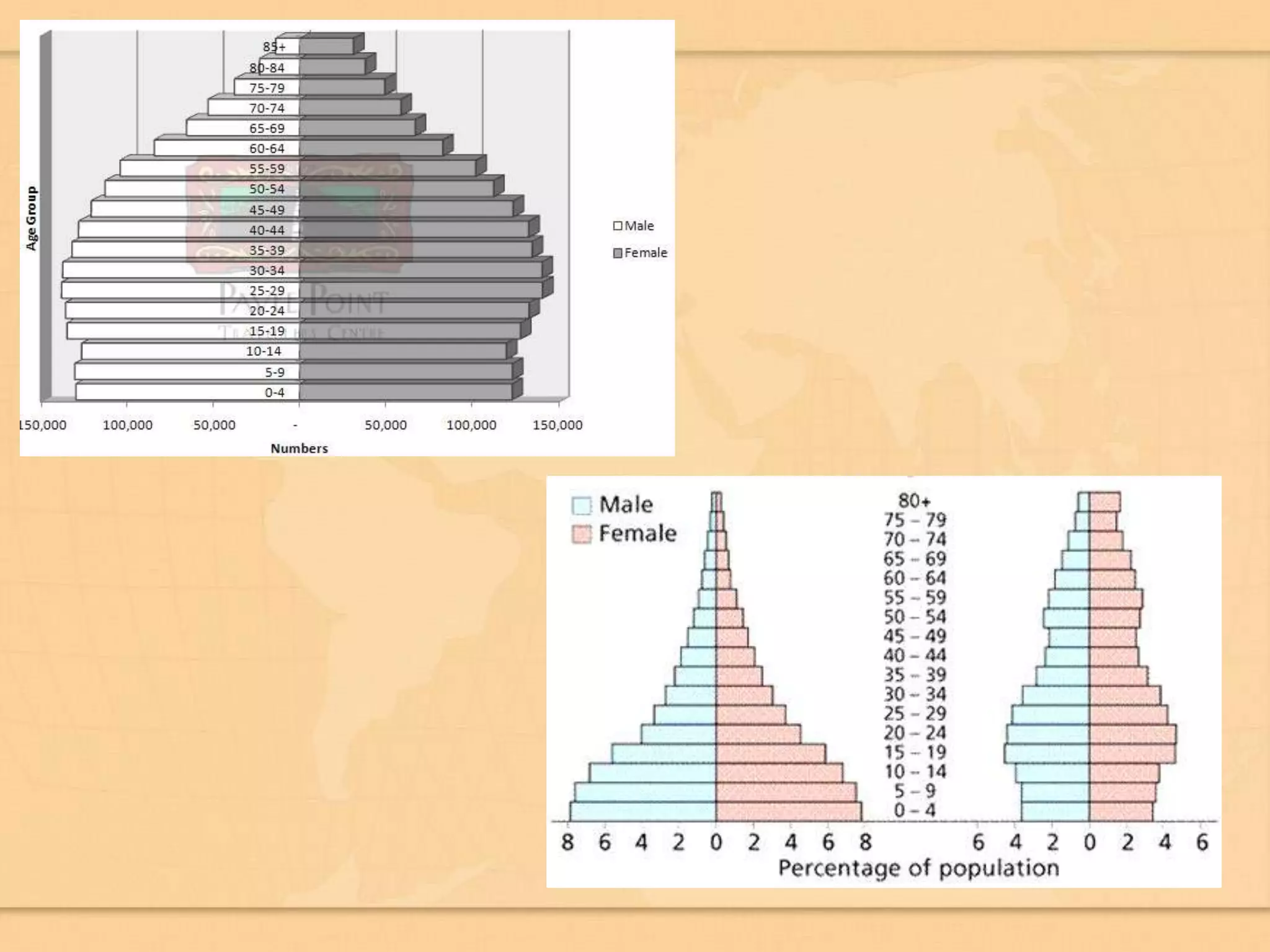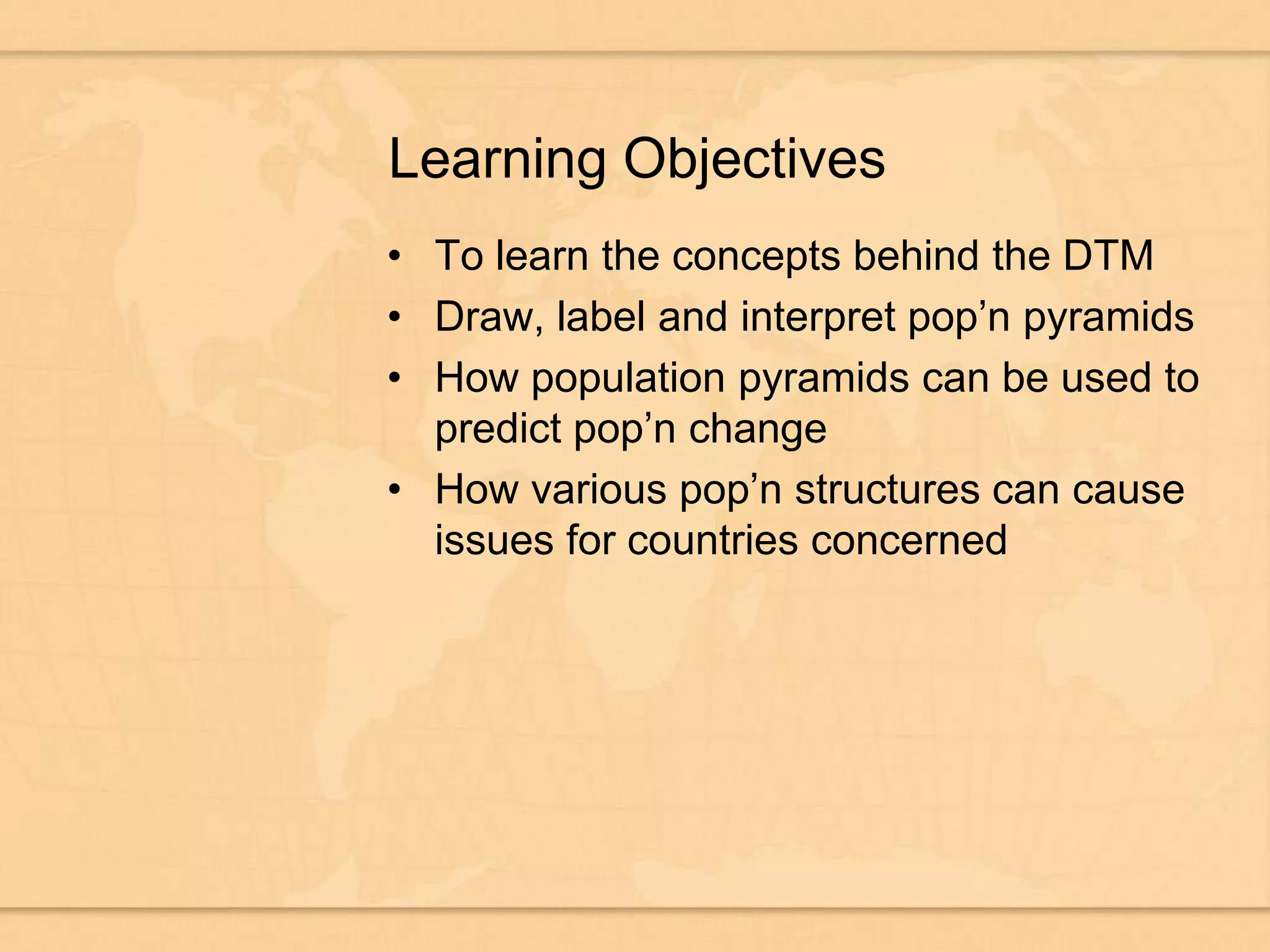 The Demographic Transition Model (DTM) is a model that shows population change over time as countries progress through four to five stages of development. It suggests that as countries industrialize, death rates fall before birth rates, leading to population growth. Eventually, birth rates also fall. The DTM helps explain population changes in industrialized countries, but is less relevant for non-industrialized nations. Population pyramids can reveal a country's population structure and predict future changes based on birth and death rates of different age groups. They may indicate issues like an aging population or low life expectancy.