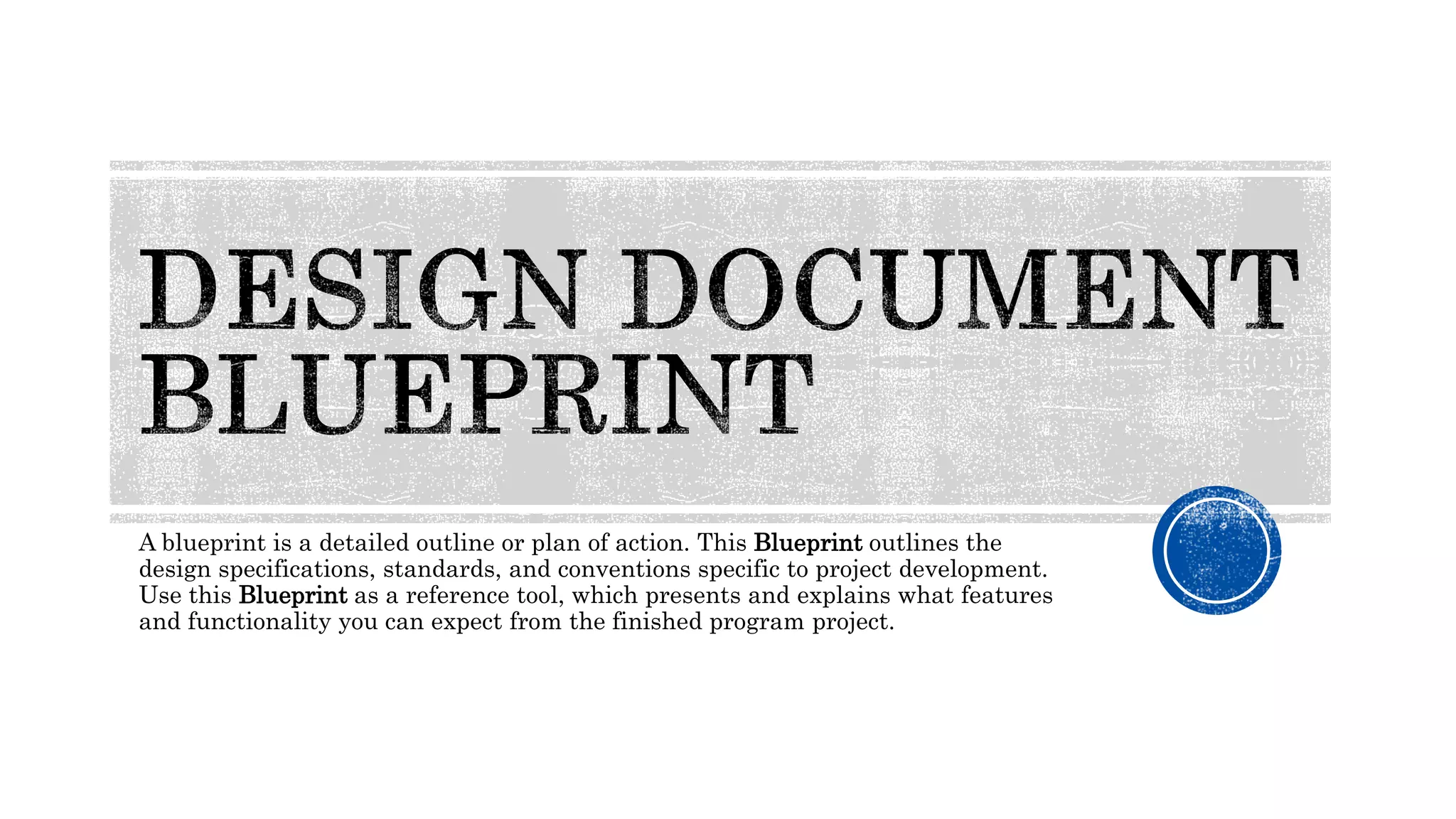 This blueprint outlines the specifications for a project and consists of six sections: project specifications, standard features, design strategy, technical specifications, media standards, and project management. It provides details on the intended audience, learning objectives, deliverables, content organization, assessment methods, and technical requirements. The blueprint serves as a reference for developing a consistent and engaging learning experience.