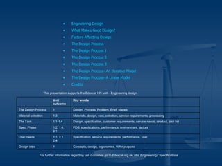 This document presents an overview of the design process in engineering, detailing its stages and methodologies related to practical problem-solving. It emphasizes the importance of considerations like materials, cost, and user needs, and outlines systematic steps from recognizing the problem to implementing and evaluating solutions. The design process is framed as both an iterative and linear model, tailored for modern engineering practices.