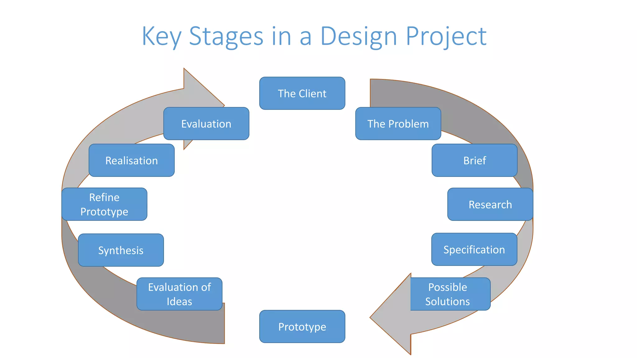 The document outlines the key stages in a design process: 1) identifying the client and the problem to be solved, 2) creating a brief to define the problem and specifications, 3) conducting research on similar problems and solutions, 4) generating possible solutions, 5) evaluating and combining ideas to create prototypes, 6) refining the prototypes based on feedback, 7) creating the final product, and 8) evaluating the final product and the design process.