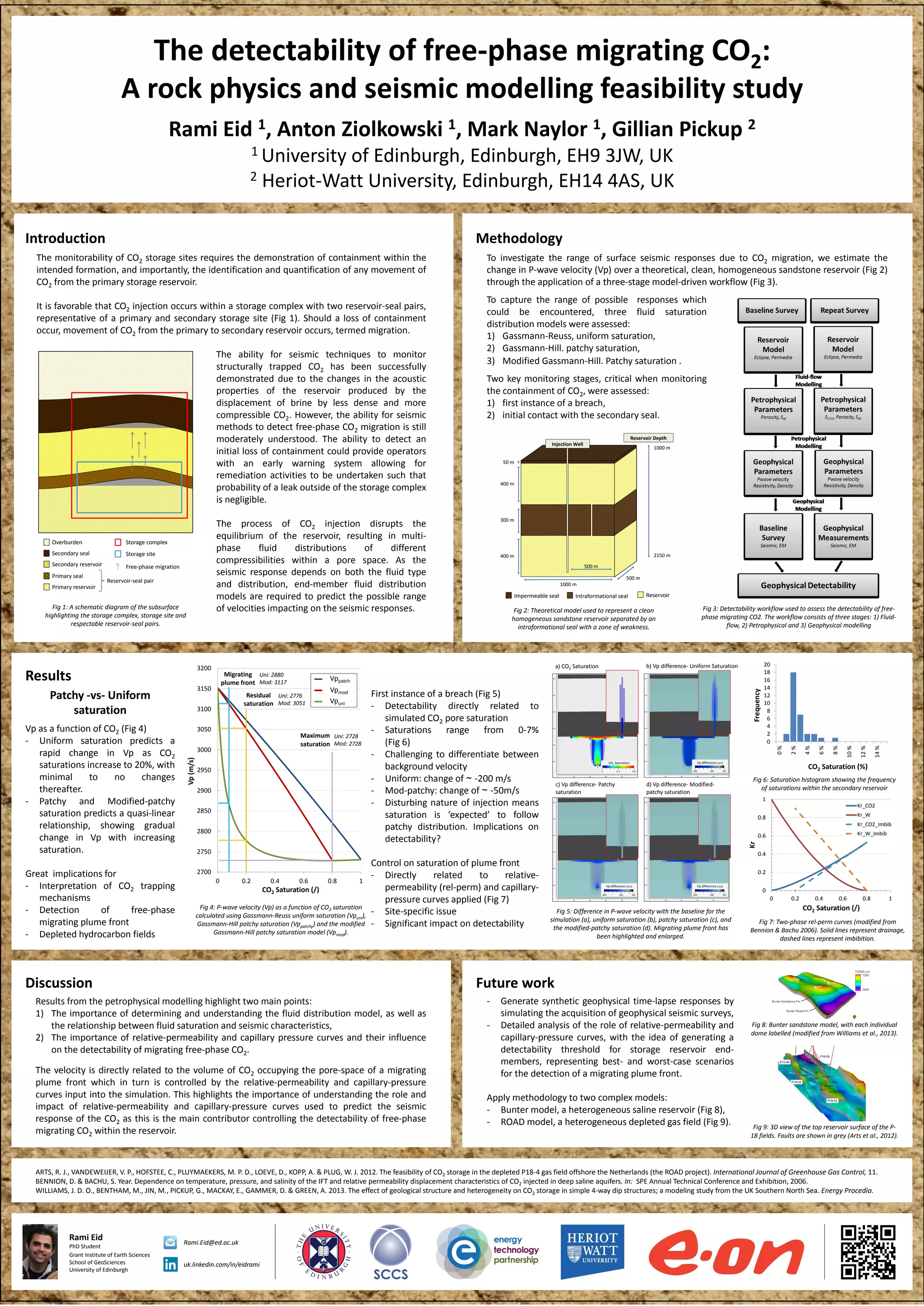 1) The document investigates the detectability of migrating carbon dioxide (CO2) using rock physics and seismic modeling of a theoretical sandstone reservoir.