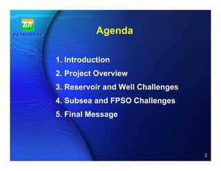 The document outlines the development of the Cascade and Chinook fields in the ultra-deep waters of the Gulf of Mexico, managed by Petrobras America Inc. It details the project overview, various challenges encountered, including reservoir, well, subsea, and FPSO difficulties, along with the operational aspects and timeline of the project. Key statistics on Petrobras, such as reserves and production, are also provided, highlighting their extensive involvement in the oil and gas sector.