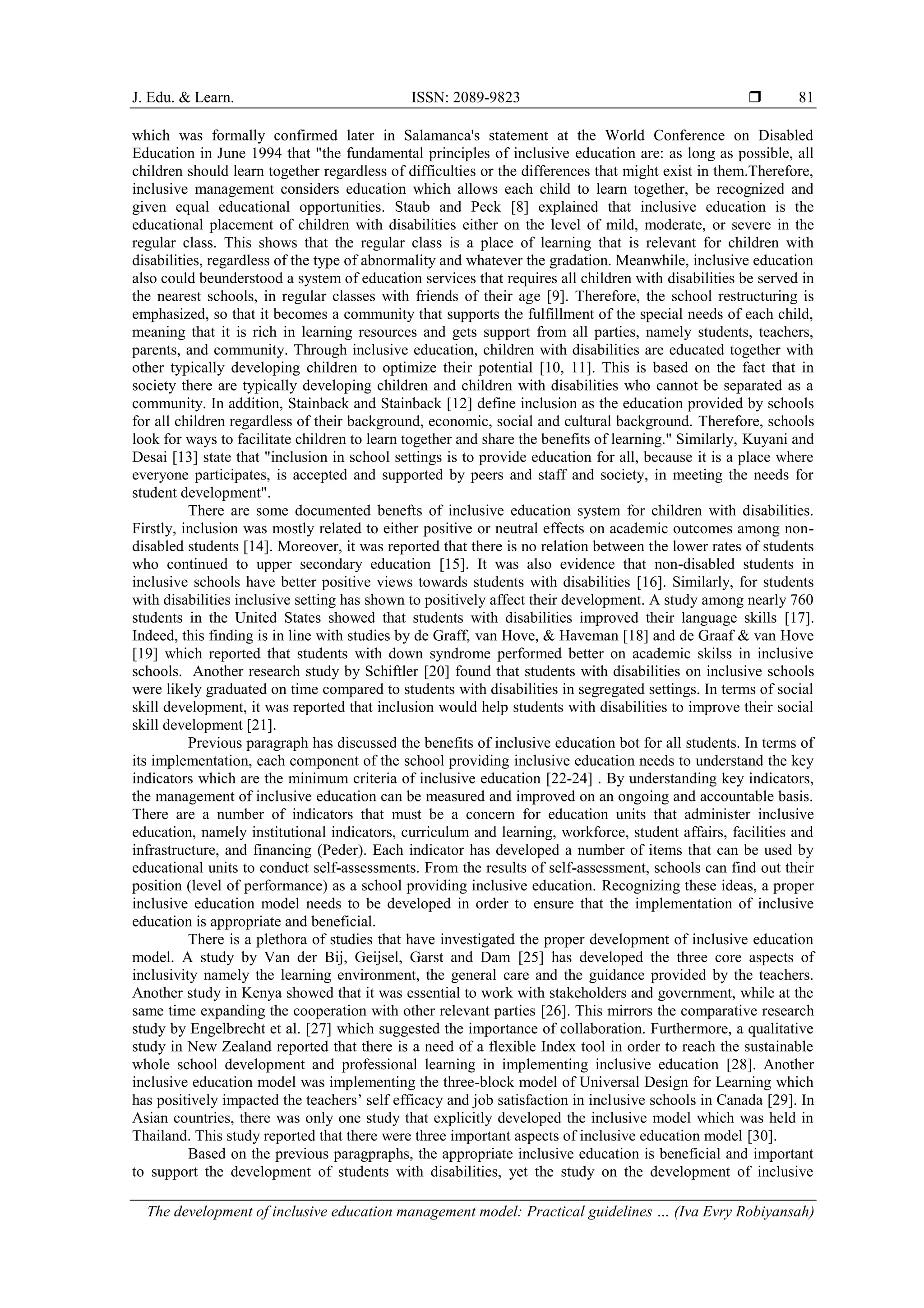 This document summarizes a research study that aimed to develop an inclusive education management model for schools in Indonesia. The study was conducted in three stages: 1) Exploring current conditions, problems, and needs of inclusive education implementation, 2) Formulating an inclusive education learning model, and 3) Determining the effectiveness of the model. Findings revealed that students and learning posed the biggest obstacles and management, students, and learning were the most important factors to consider. Based on this, the study developed a whole school inclusive education model with three stages: input, process, and output, emphasizing collaboration during implementation. A trial of the model in schools showed collaboration is essential for better inclusive education implementation.