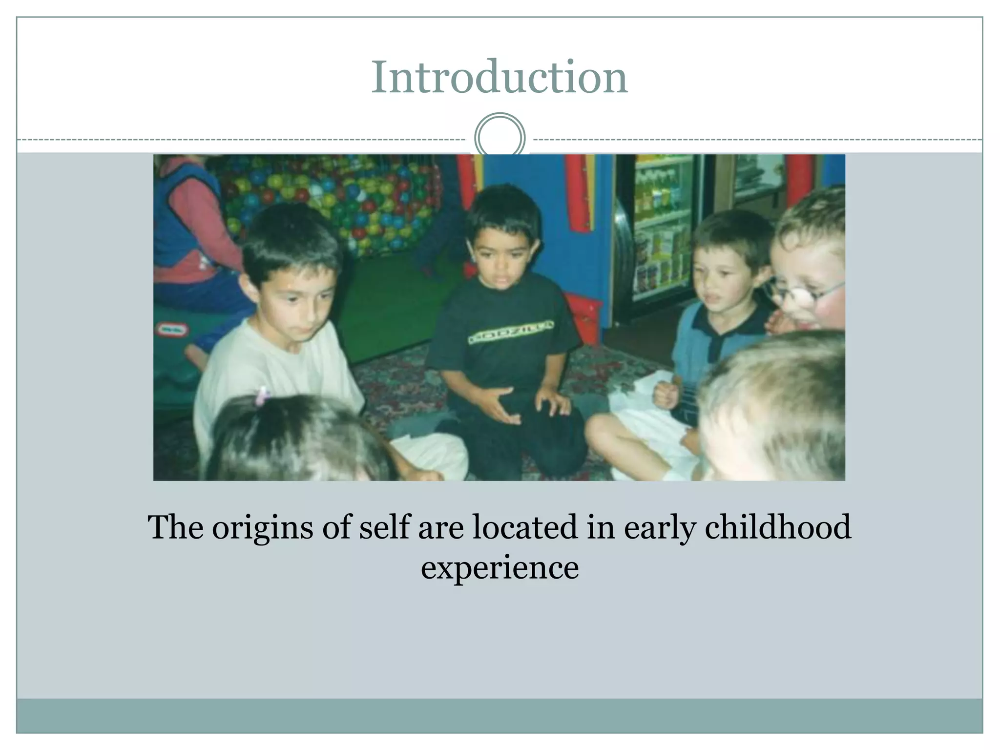 (1) The development of self originates in early childhood experiences and interactions. (2) Humans have a sense of self-awareness that allows them to see themselves from the perspectives of others, according to theorists like Mead and Cooley. Cooley's "looking glass self" theory holds that identities are formed through understanding how others see us. (3) The wider social community shapes an individual's sense of self through language and interactions that allow people to view themselves from the perspectives of others in their social relationships and develop their identity.