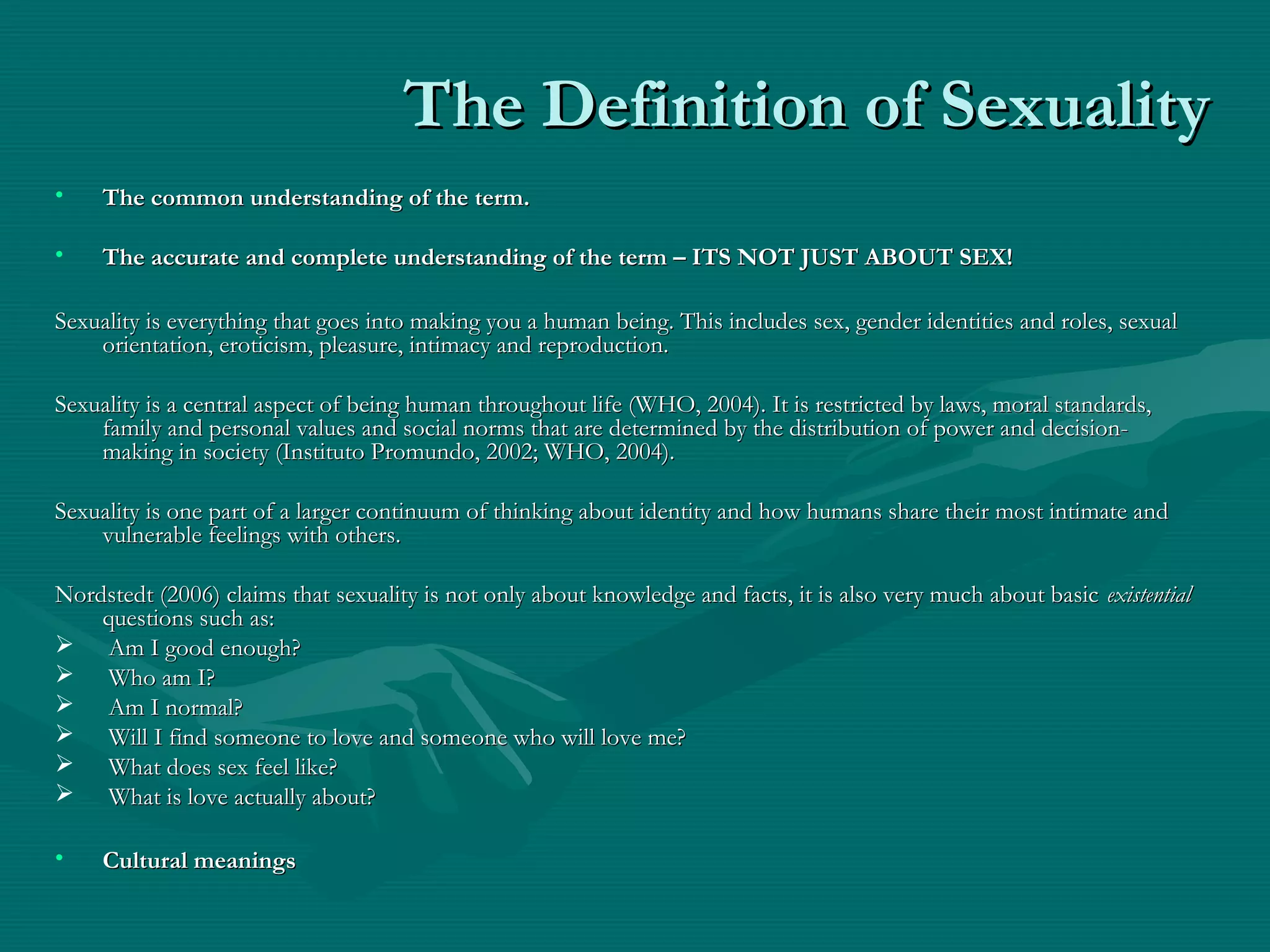 This document discusses the development of sexuality from various perspectives. It defines sexuality broadly as including sex, gender, orientation, intimacy and reproduction. It then covers the history of sexuality from ancient India, Biblical times, and Foucault's work. It discusses Freud's psychosexual stages theory and the evolutionary perspective on sexuality, noting sex differences in arousal. The document takes a broad view of sexuality as a complex human phenomenon shaped by biological and socio-cultural factors over time.
