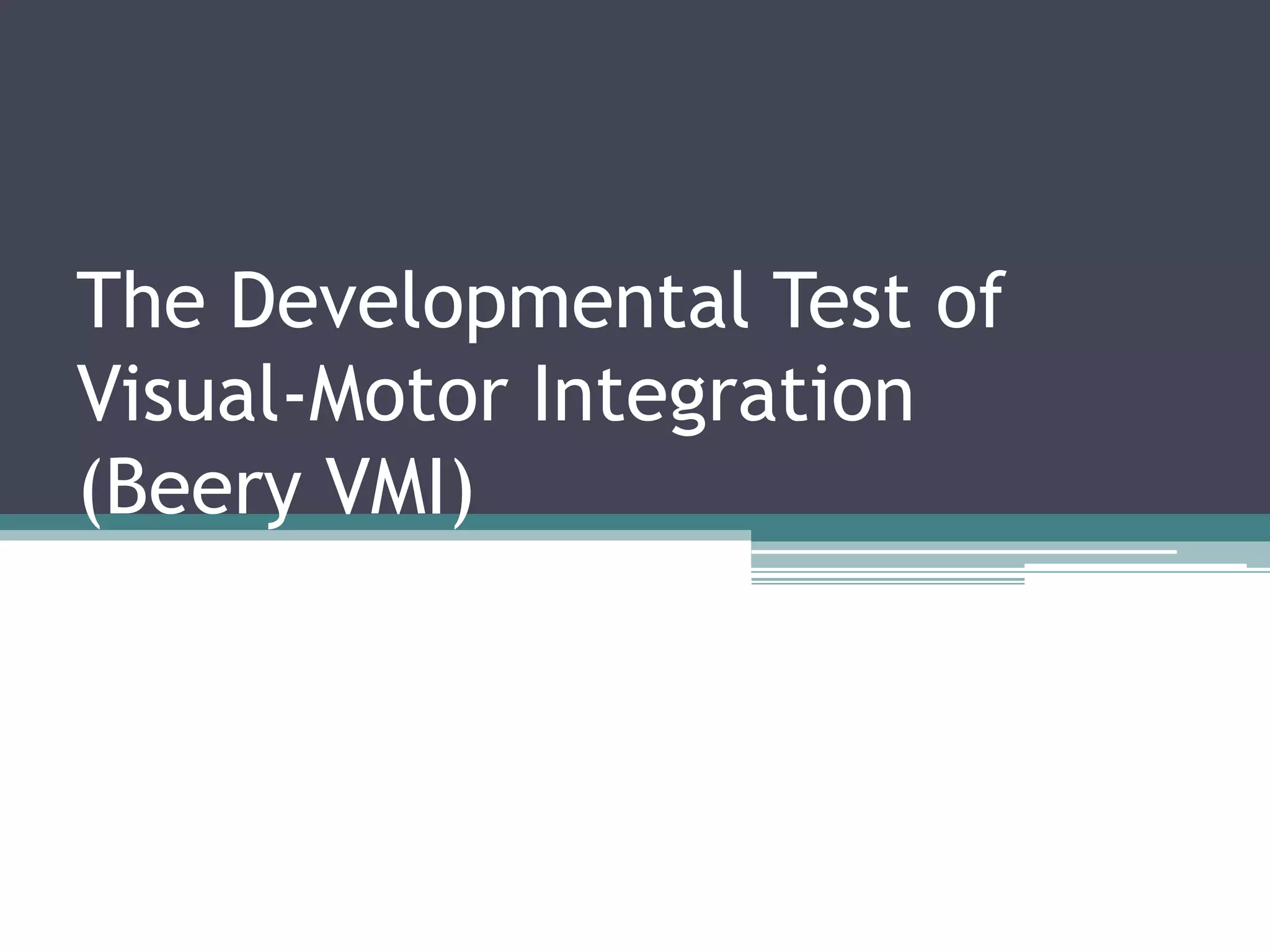 The Beery VMI is a developmental test that assesses visual-motor integration through copying geometric forms. It is designed to help identify children who may need assistance and to evaluate the effectiveness of educational interventions. The test uses simple shapes because children from different backgrounds have varying experiences with alphabets and numbers. Successful development in humans and other organisms is characterized by increasing coordination between individual parts and the whole. The Beery VMI aims to help children progress in integrating their physical, intellectual, emotional and spiritual facets.