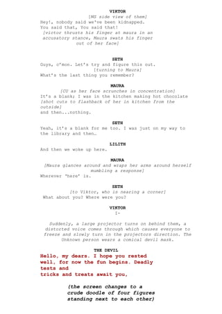 Four teenagers wake up in an abandoned school with no memory of how they got there. They are greeted by a distorted voice telling them they must complete deadly tests or they will die. One of the teenagers, Viktor, is found dead with a knife wound. The others suspect each other until they find a note on Viktor's body saying one of them is the killer. They realize they have been drugged and set against each other as part of a deadly game.