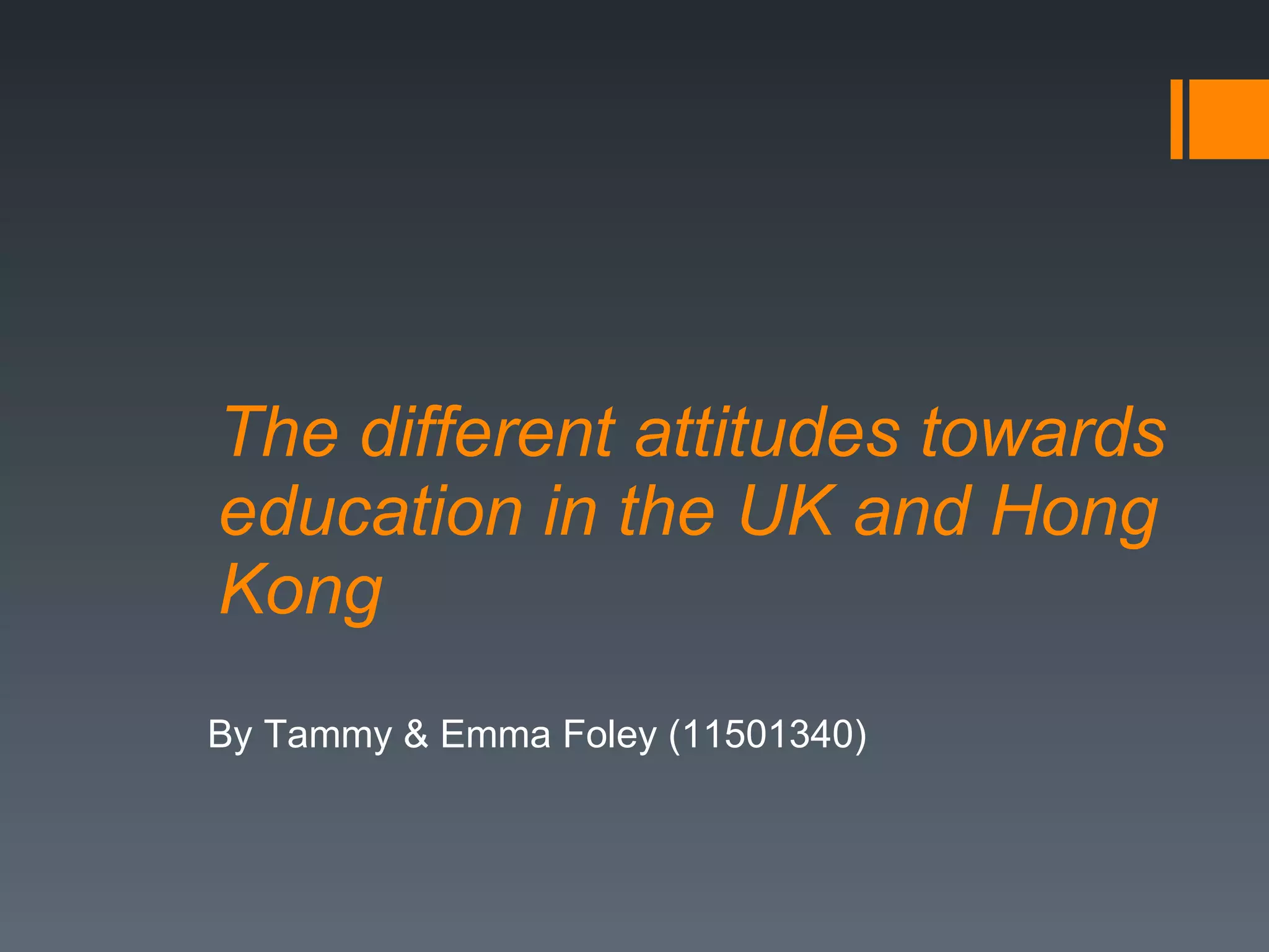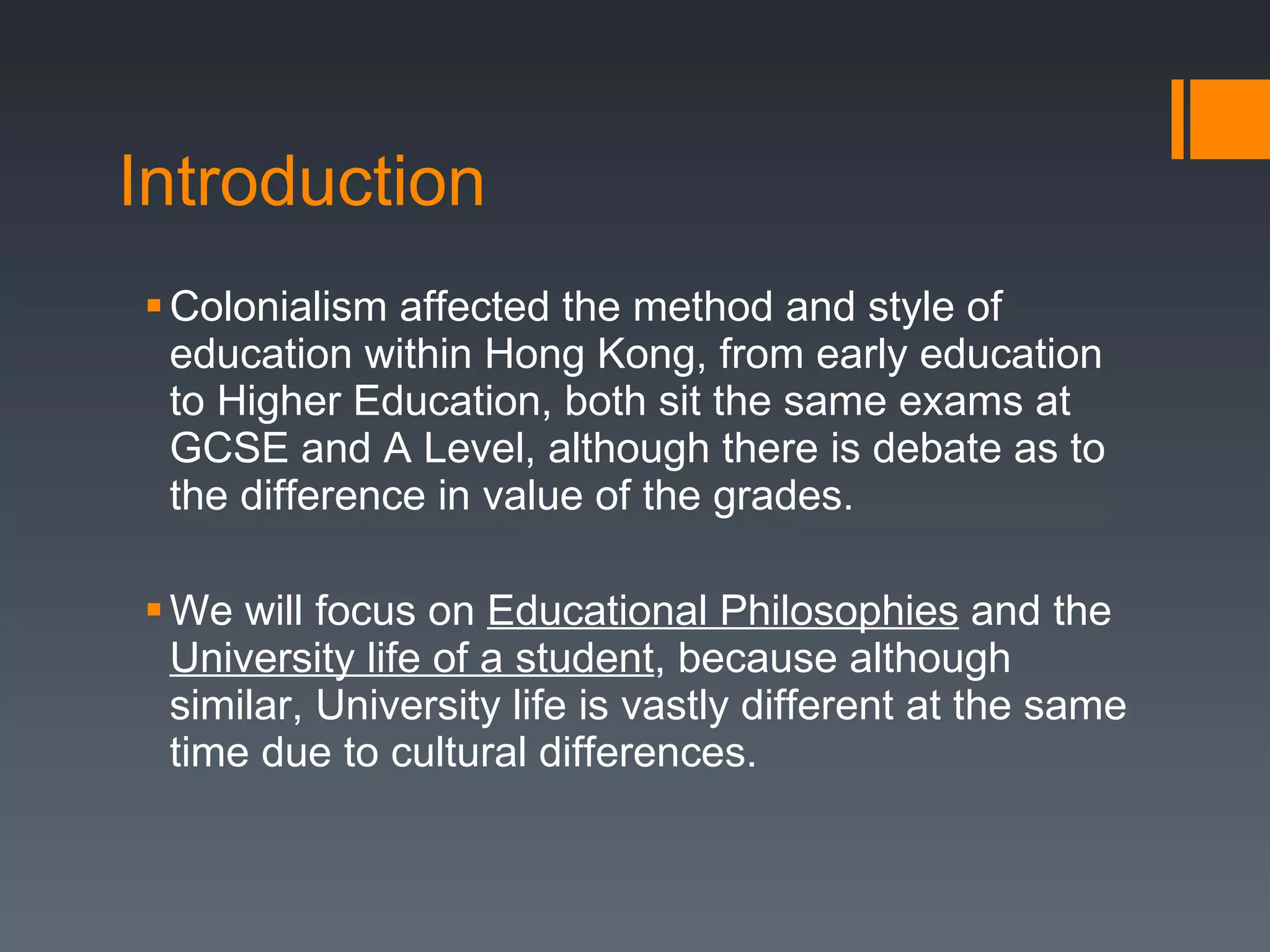 The document compares the differences in educational philosophies and university life between the UK and Hong Kong. In the UK, education emphasizes individualism, independence, creativity, and allowing students to learn through mistakes. In Hong Kong, education focuses on Confucian ideals of respecting teachers, diligence, rote learning, and parental pressure to succeed academically. University life in the UK involves social events like pub crawls to help new students socialize, while university life in Hong Kong places more emphasis on studying.