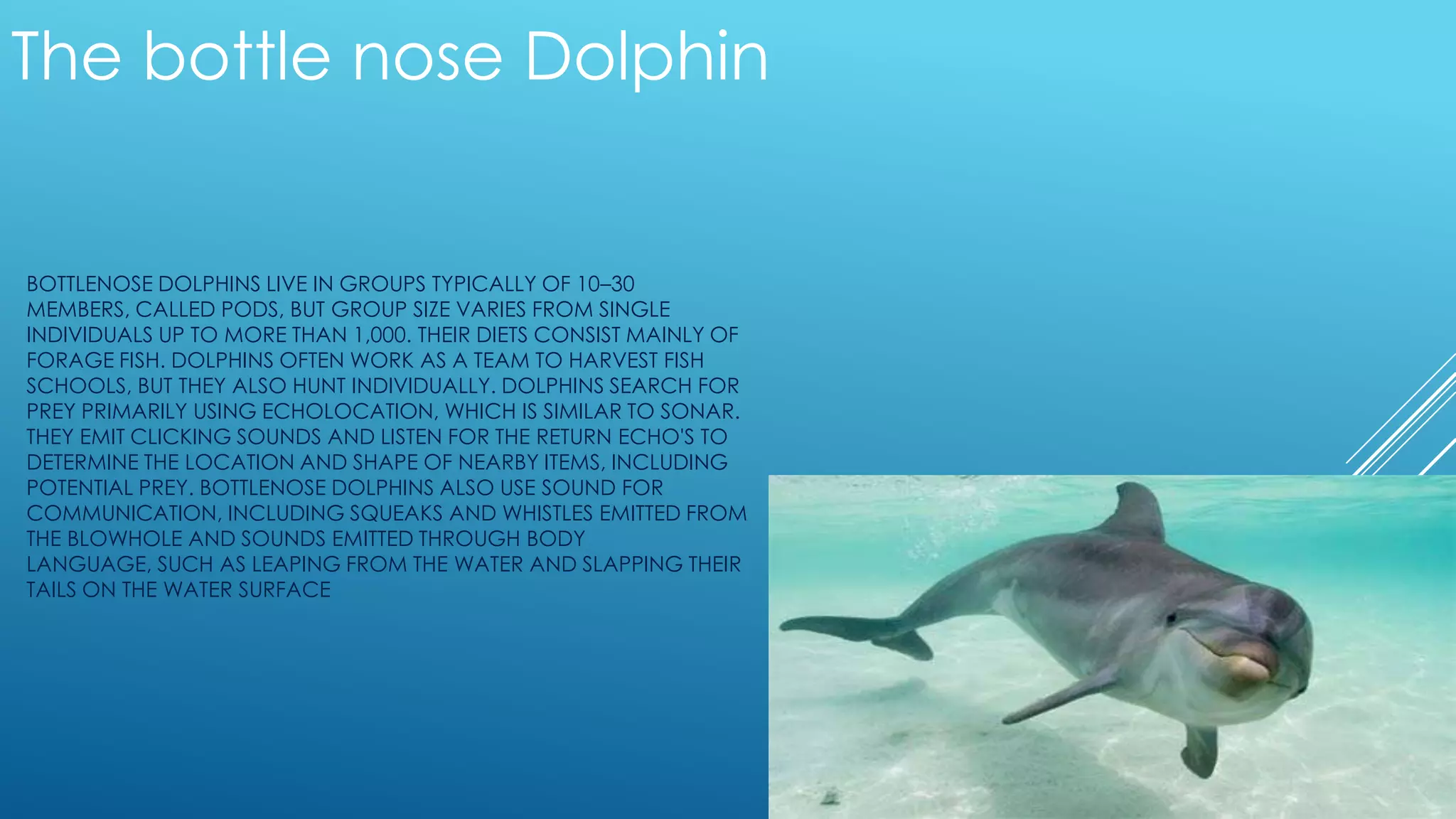Bottlenose dolphins live in pods of typically 10-30 members but sometimes over 1,000. They communicate using sounds from their blowholes and bodies. Their diet consists mainly of forage fish, which they hunt individually or cooperatively by emitting echolocation clicks to locate prey.