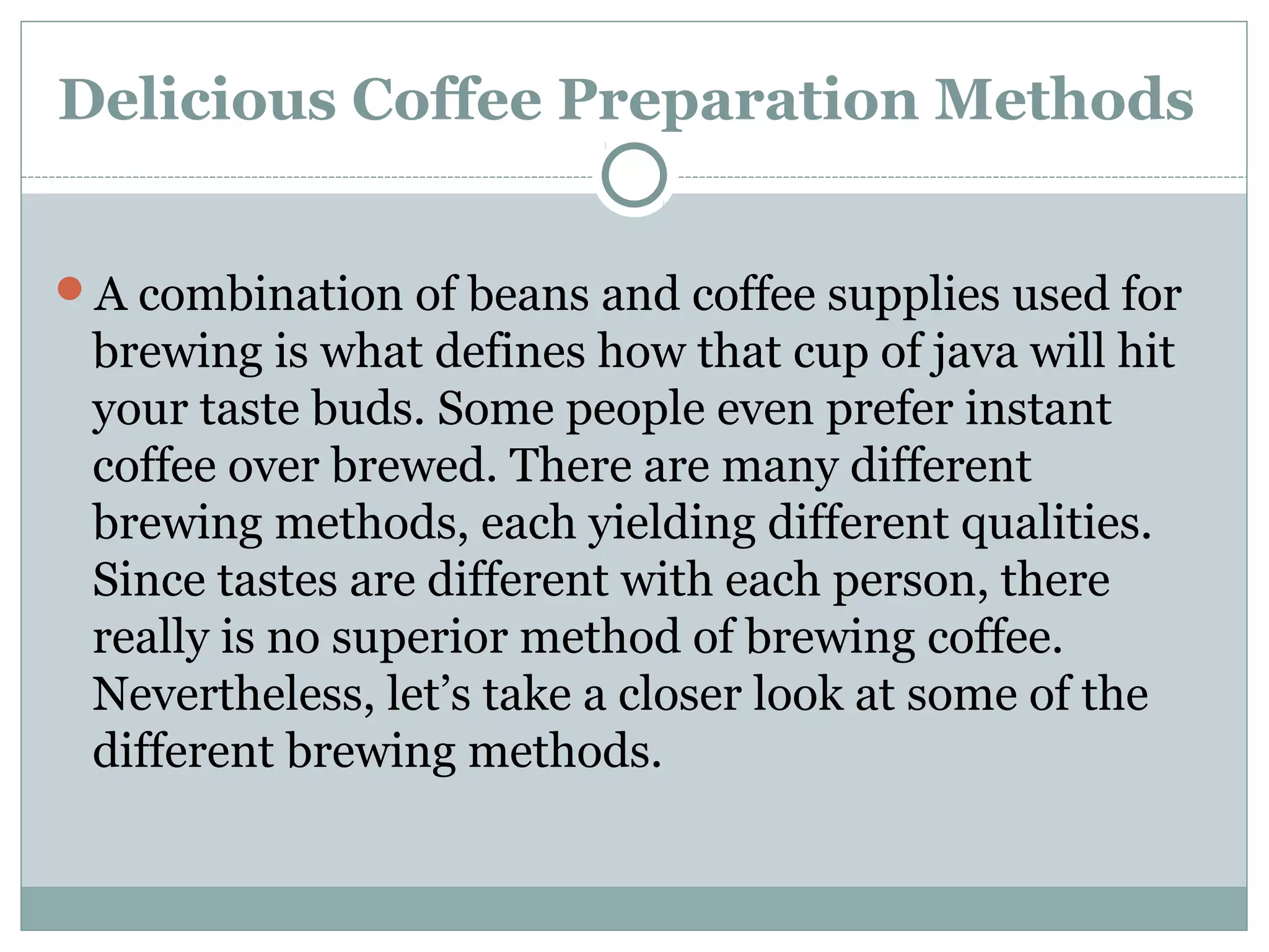 The document discusses various methods of coffee preparation, emphasizing that there is no superior method as preferences vary. It explains the importance of grind size and details popular brewing techniques such as drip brewing, neapolitan flip-drip, Turkish, cold water brewing, French press, and espresso. Each method is unique and affects the flavor and quality of the coffee.