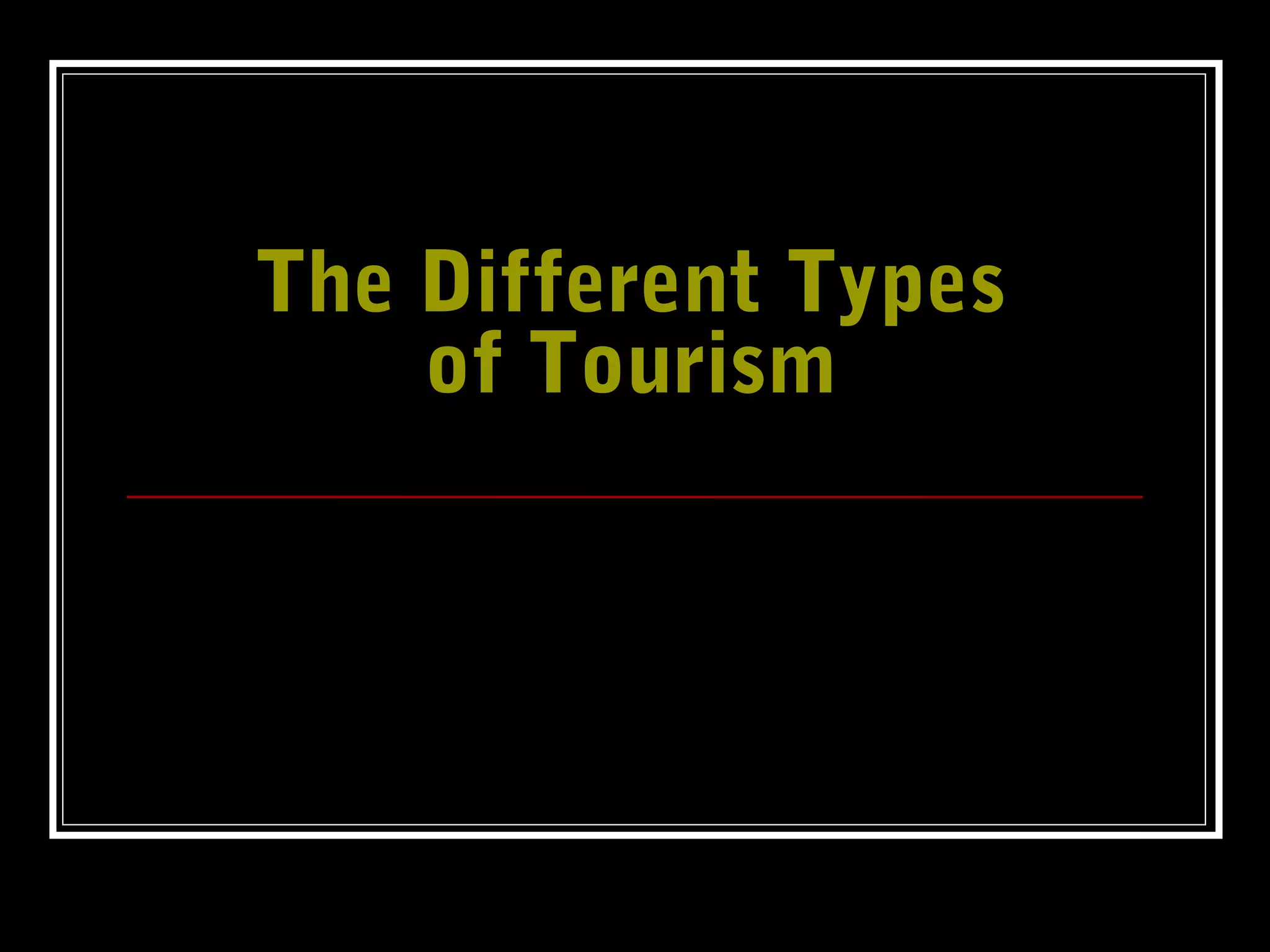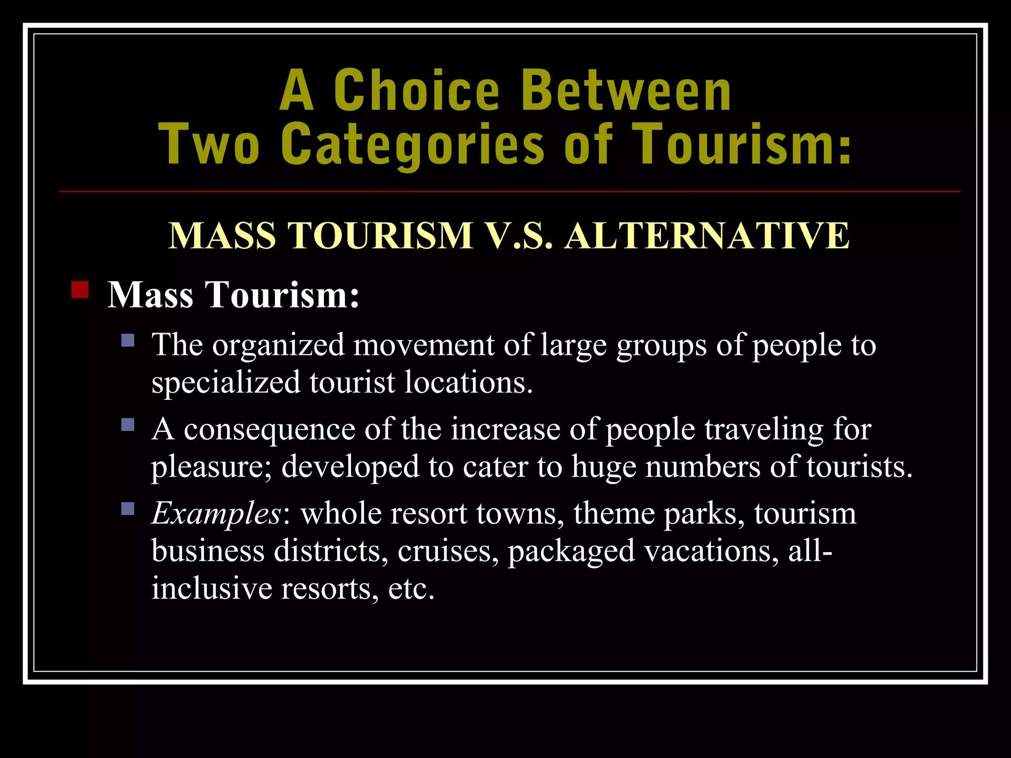 The document discusses two main categories of tourism: mass tourism and alternative tourism. Mass tourism involves large groups traveling to specialized locations with fixed programs and packages. Alternative tourism is individually planned and focuses on experiencing local cultures first-hand in secluded areas during non-peak times by arranging one's own travel. The document provides examples of different types of tourism like pleasure, business, nature, cultural, social, recreation, active, sports, religious, health, adventure, wilderness, and ecotourism.