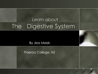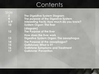 The digestive system ingests food, breaks it down for nutrient absorption, and eliminates waste. It contains major organs like the liver, stomach, and pancreas. The liver performs many functions, including producing bile to break down fat and helping blood clotting and temperature regulation. Gallstones form when liquid in the gallbladder hardens into pieces and can cause pain, nausea, and other symptoms. Treatment may include drugs to dissolve stones or surgery to remove the gallbladder. Maintaining a healthy lifestyle can help prevent gallstones.