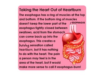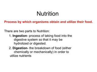 The document summarizes key aspects of human digestion. It begins with an overview of nutrition and the two main parts - ingestion and digestion. It then describes the major components of the human digestive system from mouth to anus. Key functions and processes at each stage are highlighted, including mechanical and chemical breakdown of food. Absorption of nutrients primarily occurs in the small intestine. Undigested material then passes to the large intestine where water is absorbed before waste is excreted.
