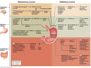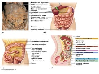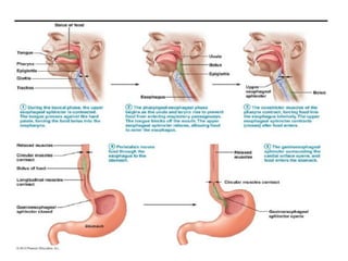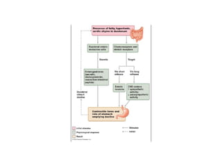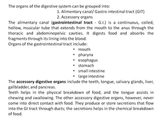 The digestive system performs six main functions: ingestion, secretion, mixing/propulsion, digestion, absorption, and defecation. The small intestine plays a key role in digestion and absorption. It completes the breakdown of carbohydrates, proteins and lipids through enzymes and absorbs over 90% of nutrients. Movements like segmentations and migrating motility complexes mix contents to bring them in contact with the intestinal wall for absorption and propel digestion forward.