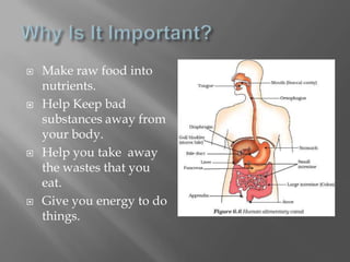 The digestive system breaks down raw food into nutrients, helps prevent harmful substances from entering the body, and removes waste. It includes the mouth, esophagus, stomach, liver, large intestine, rectum, and anus. The mouth chews food and the esophagus transports it to the stomach. The stomach further breaks down food using acids and enzymes before sending it to the small intestine for nutrient absorption. The liver produces sugars and fatty substances while the large intestine collects and moves waste to the rectum and anus for excretion.
